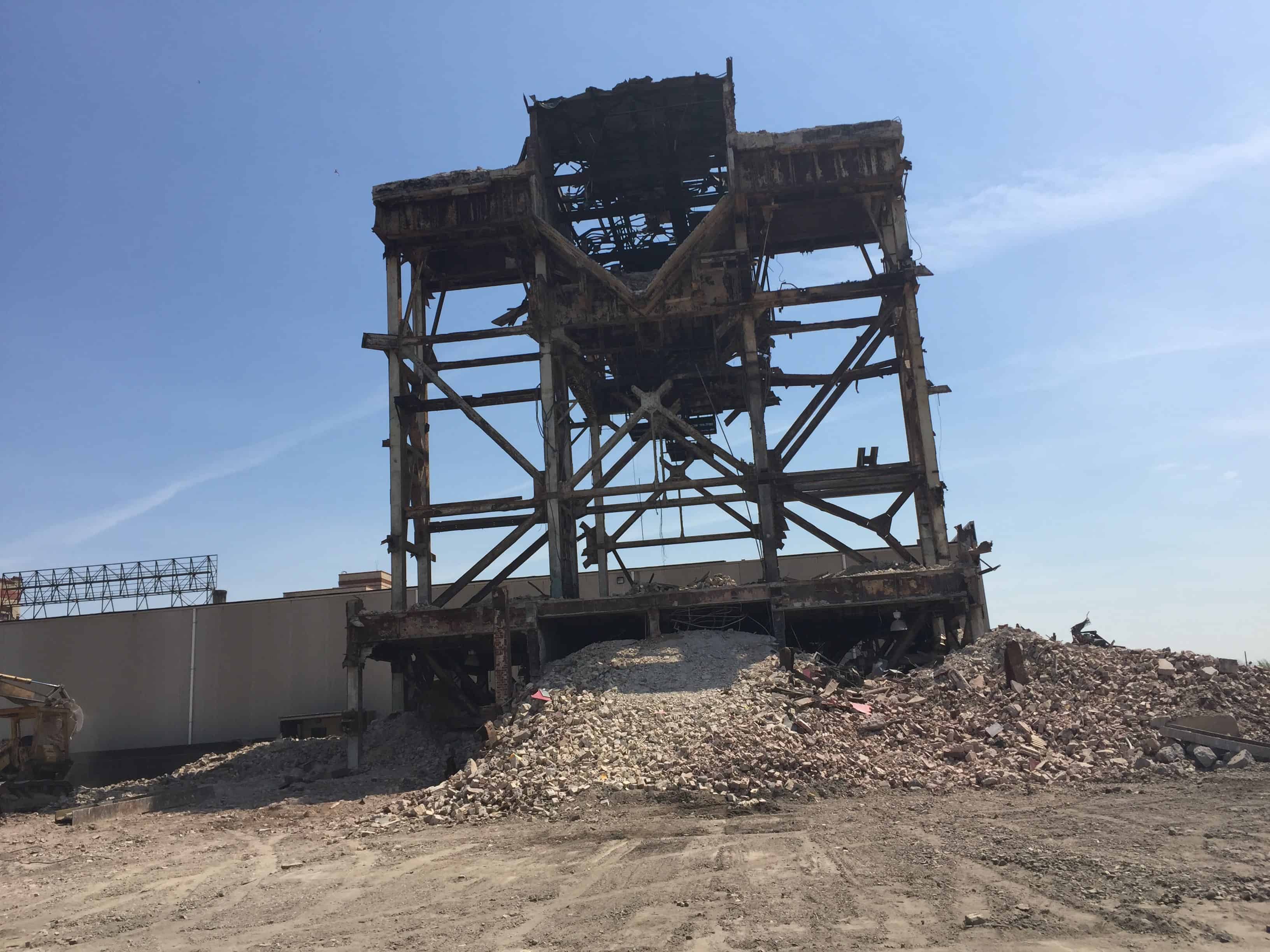 The powerhouse was a 100’ x 100’ x 100’ high steel framed structure with brick exterior walls, a poured in place concrete floor supported  by steel approximately 18’ above grade and a concrete/steel coal bunker running east to west and hung from the roof steel approximately 25’ wide by 90’ long. Atop the powerhouse’s roof were (2) 20’ diameter by 200’ high redial brick chimneys.