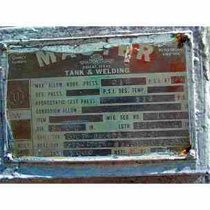 7,000 gallon Master Tank & Welding carbon steel horizontal pressure storage tank. Rated 212 psi @ 100 F. 84" high x 27' long. National Board # 4742; Serial # D-1466. With saddles, manway, and magnatel float guage. Welded loose. Approx. Weight- 13,500 lbs.