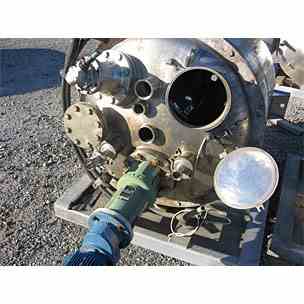 Used 150 gallon T-316L kettle 34" diameter x 4' high straight side. Bolted dished top, welded dished bottom. Electric polish internal equipped with fractional HP Lightnin agitator. Internal rated atmospheric @ 250 degrees F. Stainless jacket 30 psi @ 250 degrees F. NB# 5175. Top Fittings- sanitary style (4) 3" and (1) 2", flanged style (1) 4" and (1) 5", has 10" handhole. Bottom head has center bottom drain (3" - Need to confirm).
