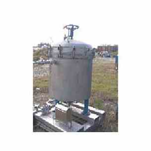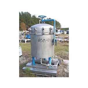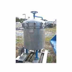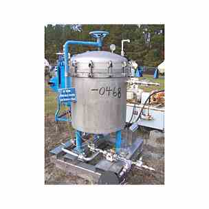 33" Sparkler Filters, Inc. horizontal pressure leaf 316 stainless steel filter. Model# 33-D-12. National Board# 2830. S/N 23408. Built 1997. Internal rated 60 PSI @ -20 to 350 degrees F. Handwheel located on top for lifting the clamped top and allowing it to swivel out of the way. Fittings top: 1/4" for pressure gauge and 1/2" for bleed valve. 2" top side inlet. 3" center bottom outlet and 2" bottom scavenger outlet (each tie together to a 1 1/2" discharge pipe with a sightglass). Mounted on carbon steel legs to a stainless steel skid.