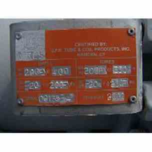 UNUSED 35 sq. ft. JFD Tube & Coil productions, INC. vertical carbon steel shell and tube Heat Exchanger. Shell rated 200/FV @ -20 to 400 F. Tubes rated 200/FV @ -20 to 350 F. Serial # 00135-4 Built in 2000. Mounted on 3 angle iron legs.