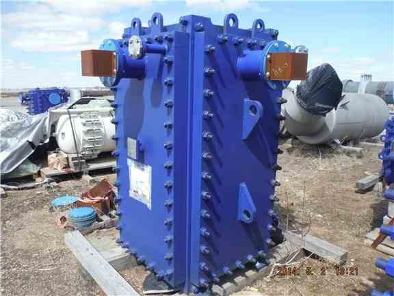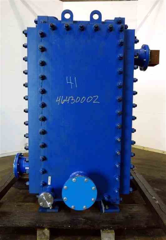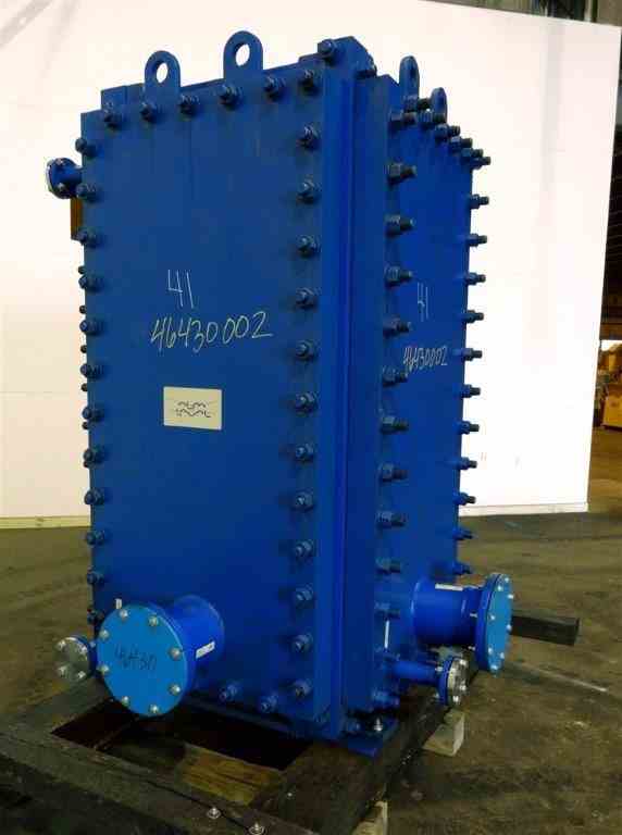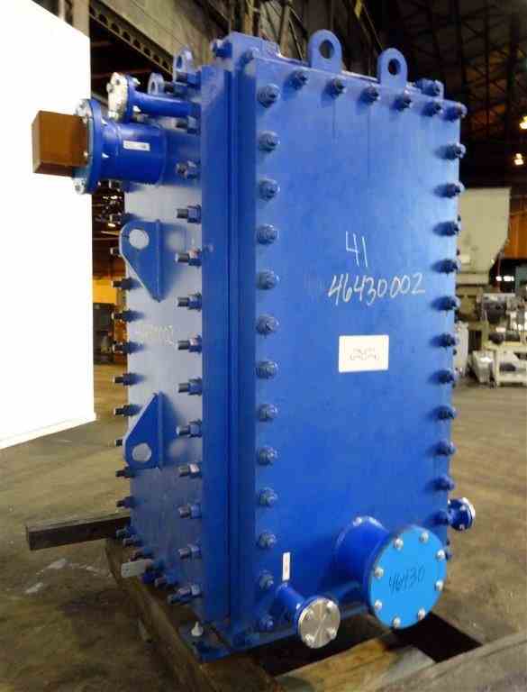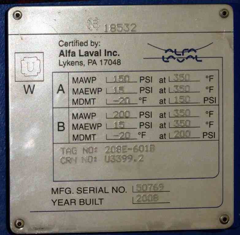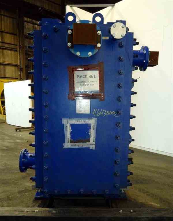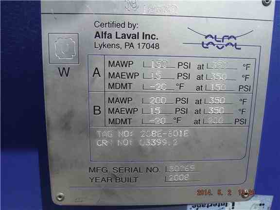Unused 2063.4 Sq Ft Alfa Laval Vertical 316L Stainless Steel Plate Heat Exchanger, Compabloc Type, Model Number CPL75-V-300. Rated 150 psi/FV @ 350 F on the hot side (A); rated 200 psi/FV @ 350 F on the cold side (B). (300) Plates. Frame Size: 46.5” x 48” x 85.5”. Carbon steel removable side panels faced with stainless steel. 8" Inlets & outlet, 2" vents. Weight 22,300 lbs. National Board #18532, Serial # 50769, Built 2008