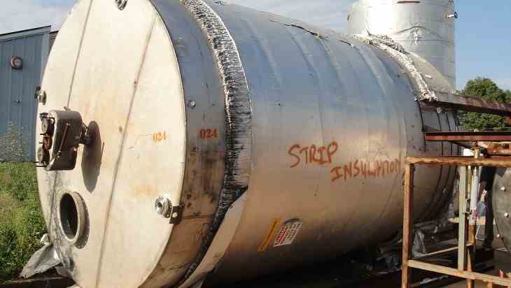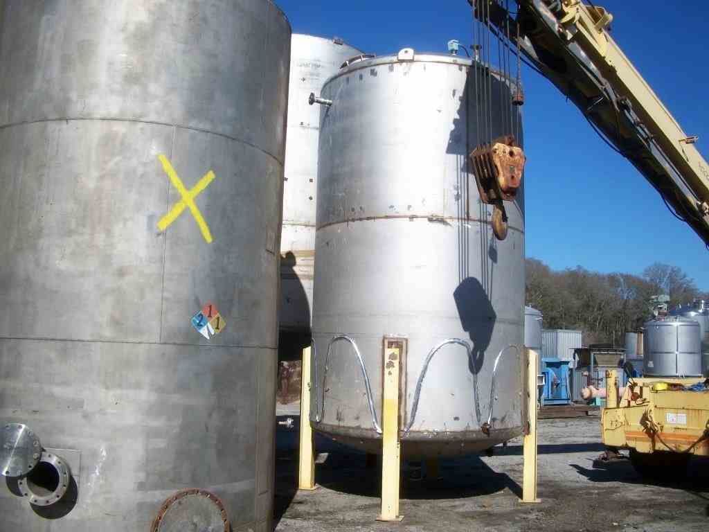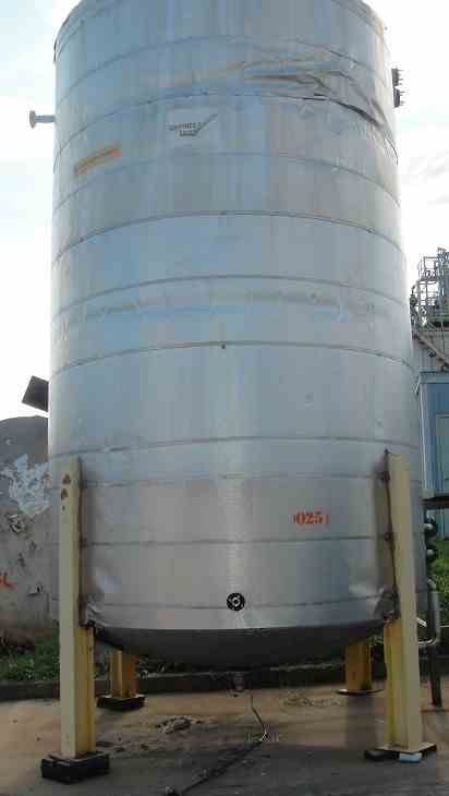 Used approximately 7600 gallon vertical 304 stainless steel tank. 9' diameter X 16' high straight side. (OAH- 19'8") Flat top, cone bottom, Top fittings: 18" manway, (3) 2" top inlets, 4" center bottom drain, (2) 1" side top and bottom inlets, (3) 2" side top inlets, and (3) 2" side bottom outlets. Mounted on legs. Wt: Approx 7500 lbs.