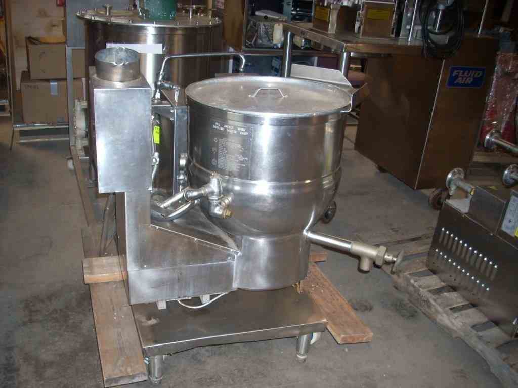 Used Groen 20 gallon Model DHT/P-20 stainless steel tilting steam kettle. Open top. Hemi bottom. Steam Jacket rated 50 psi @ 300 degrees F. Self contained heat source. Power requirements. 115 Volt 60 hz 1 phase 1 amp. Natural gas 72,000 BTU. On stand. NB 136312. SN 47120-1. Built 1989.