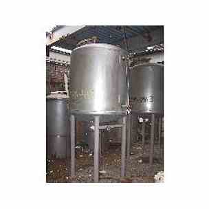 500 gallon stainless steel tank. 50" diameter X 50" high straight side. Welded dished heads. Fittings top: (1) 1", (1) 2", and (1) 18" manway. 1" center bottom drain. (3) 3/4" side outlets for level indicators. Mounted on legs.