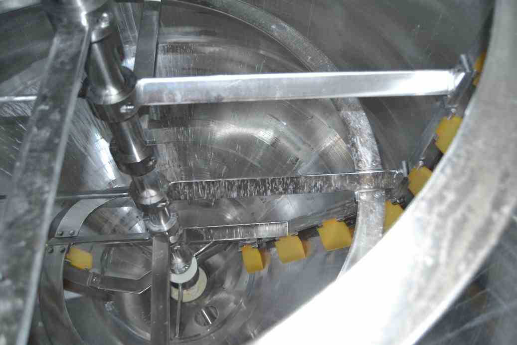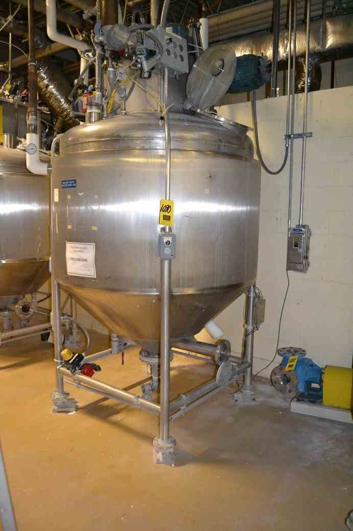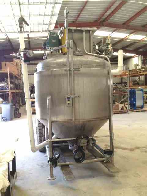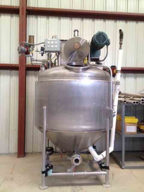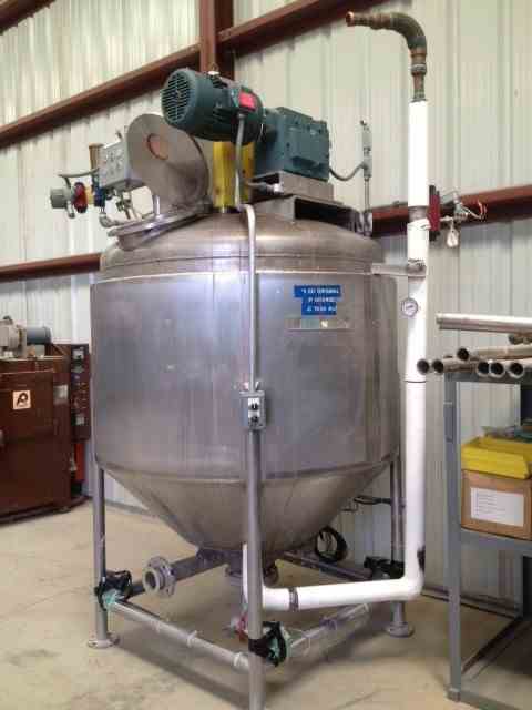 Used approx 500 Gallon Vacuum Mix Kettle. Jacketed and equipped with Scrapper agitation driven by 5 HP, 220/440 volt, 3 Phase. Agitator output approx. 15 RPM. Jacket Hydro-tested to 30 PSI. Sanitary construction. Dish top and Cone Bottom. Has actuator controlled top manway. 4'9" ID x 35" T/T. Approx. 9'5" OAH. Last used in toothpaste manufacturing.