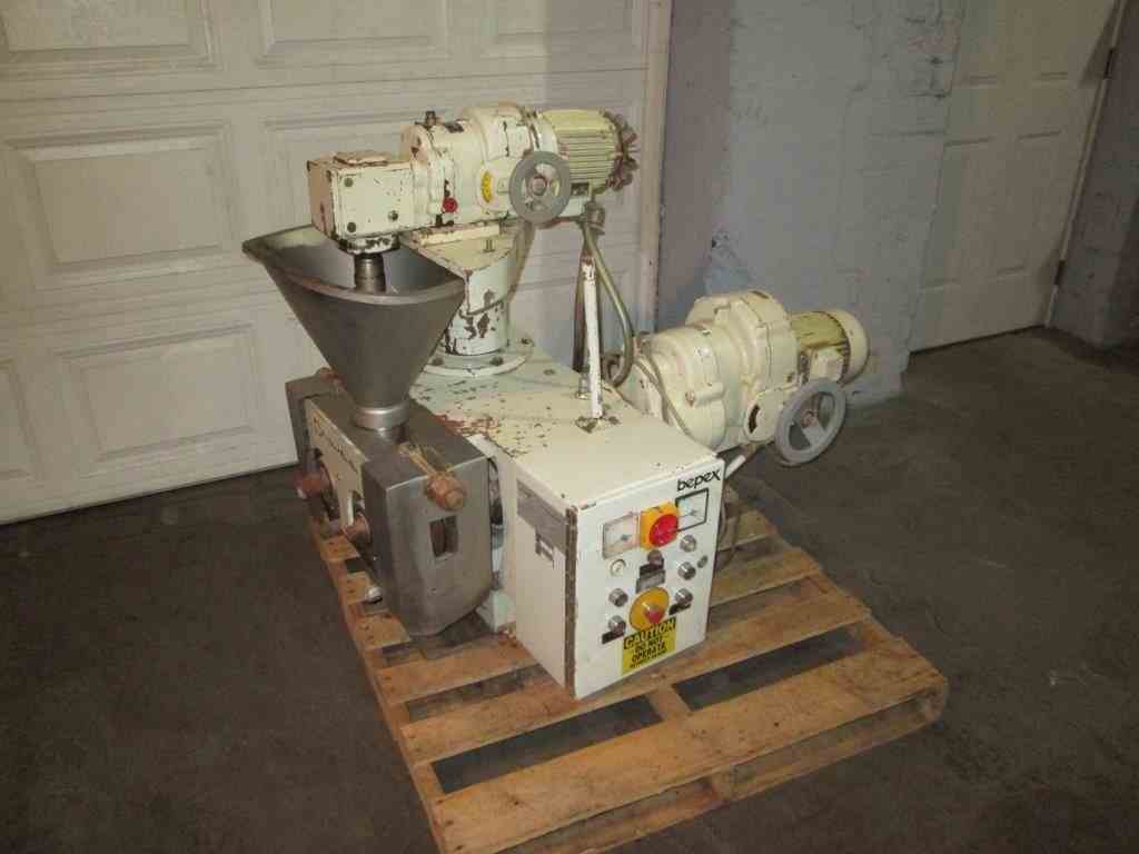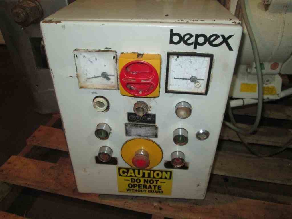 Used Bepex Hutt Roll Compactor, Type L200/50. 50 mm x 200 mm diameter rolls Stainless steel feed hopper and auger. Feed hopper with 1 hp variable speed auger.