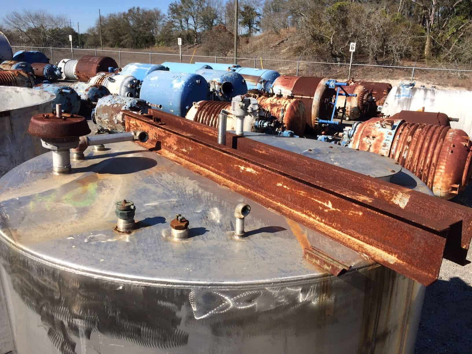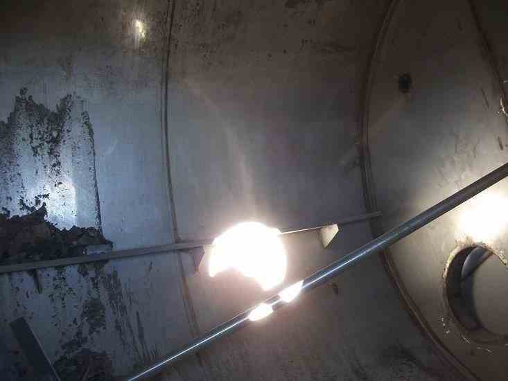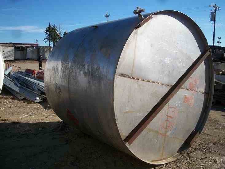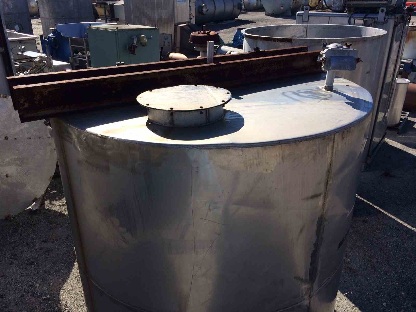 Used approximately 3000 gallon stainless steel vertical mix tank. 96" diameter X 96" high straight side. Top fittings: (5) 2" NPT, (1) 1" NPT, (1) 3", and (1) 16' manway with cover. 18" side bottom manway (missing cover), 2" side bottom drain. Flat top, sloping bottom. (4) internal baffles. Has (4) pitched-blade agitator (no motor or drive)