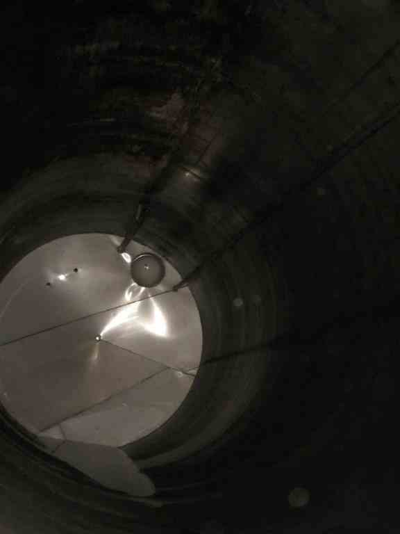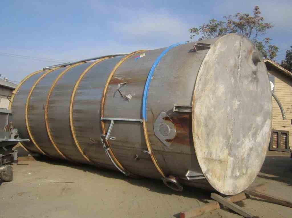 Used 13,900 gallon 304 stainless steel mix tank by Trumbo Welding Fabricating with bottom mounted heating/cooling coils. Tank measures 10' diameter x 23'8" tall with cone top and slope bottom. Unit includes 3" side bottom discharge, 19" side bottom manway and 15 HP bottom side agitation, 2" diameter coils. Unit mfg new 1978, serial number 24638B.