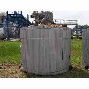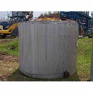 Used 2500 gallon Poly processing vertical polyethylene tank. 8' diameter X 7' 4" height. Mild dished top, flat bottom. Fittings 1-1", 1-2", 3-4", 1-24" manway. Wrapped in aluminum sheathing. Built 1991