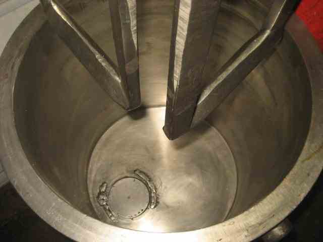Used 25 gallon Ross Double Planetary Mixer. Serial number 1068544. Stainless steel contact parts. Vacuum cover. Mix can stainless steel (not jacketed). Air over oil lift. Machine presently mounted on a I-beam riser. Glass inspection ports.