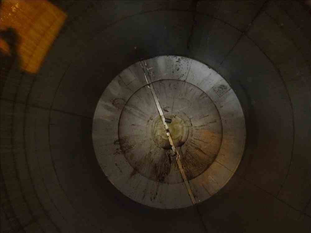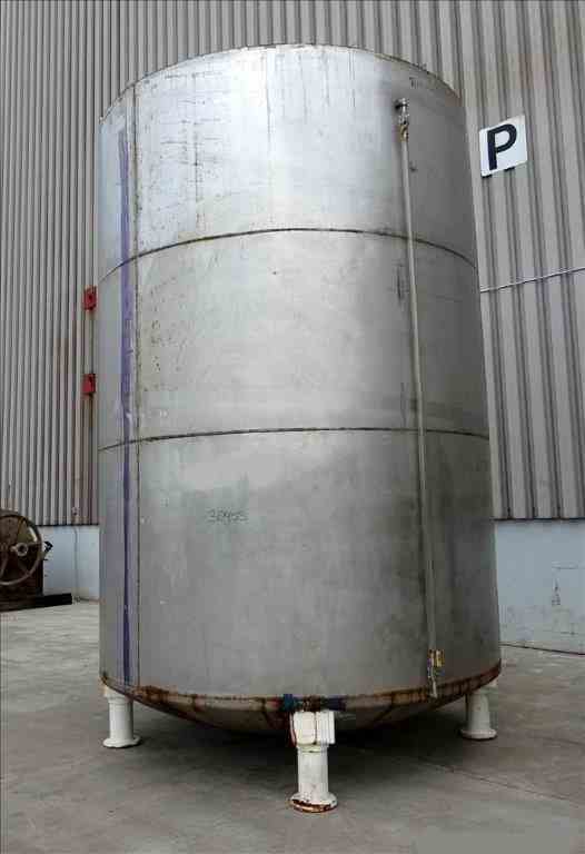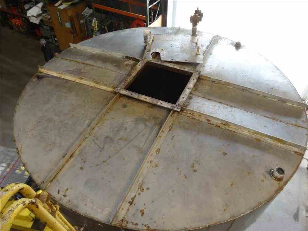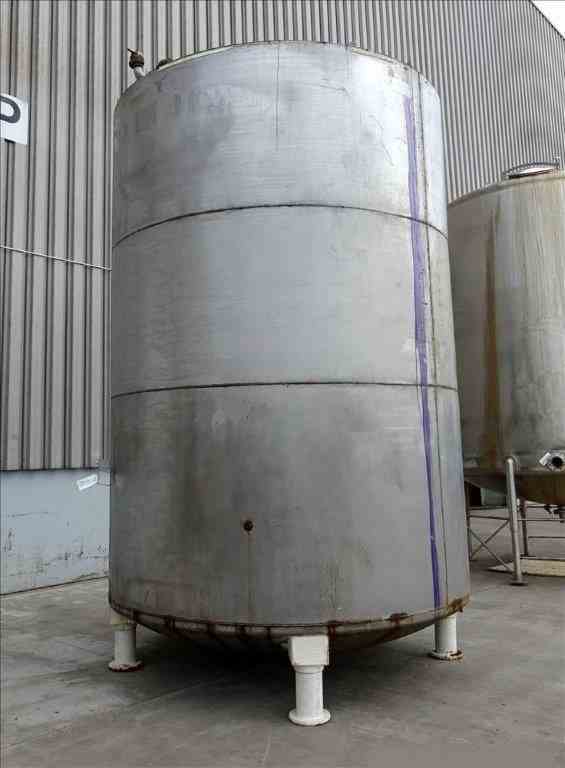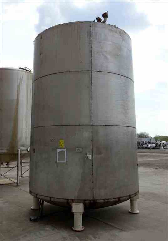 Used Approximate 6,500 Gallon, 304 Stainless Steel, Vertical Tank. Approximate 9' diameter x 13' straight side. Flat top, dished bottom. Openings top: 22" x 22" with cover, (3) 2", (1) 1-1/2". 2" Center bottom outlet. Mounted on (4) carbon steel legs. No manufacturers tag.