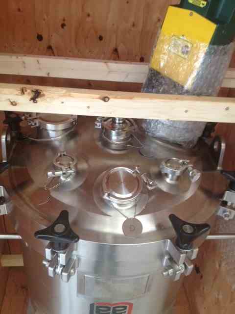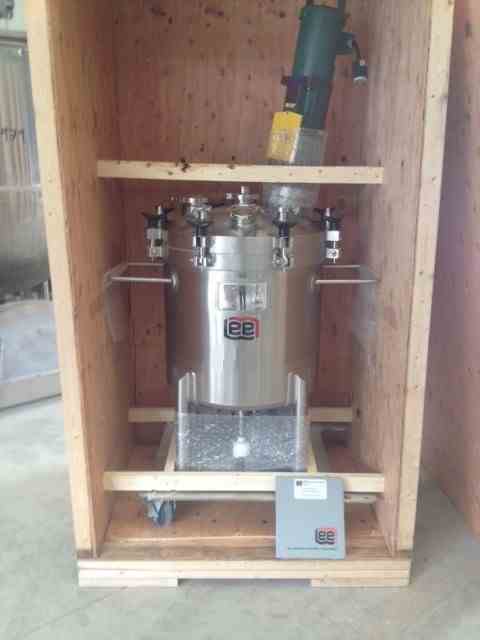 UNUSED LEE 200 Liter (50 Gallon) Mixing Vessel. Rated 50 PSI @ 300 Deg.F. 316 Stainless Steel. 26" ID x 2' Straight Side. Has Lightning model X5S25, 1/4 HP, 350 RPM, 230 volt, 3 ph mixer. 20 Ra finish. Has removable head with swing clamps. Mounted on Stainless steel cart on wheels. Sanitary vessel. Model: DBT-200L, S/N: 36321-1 NB# 10009.