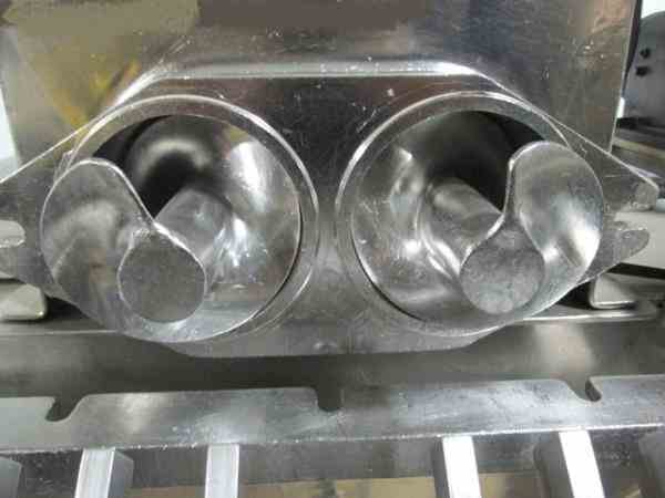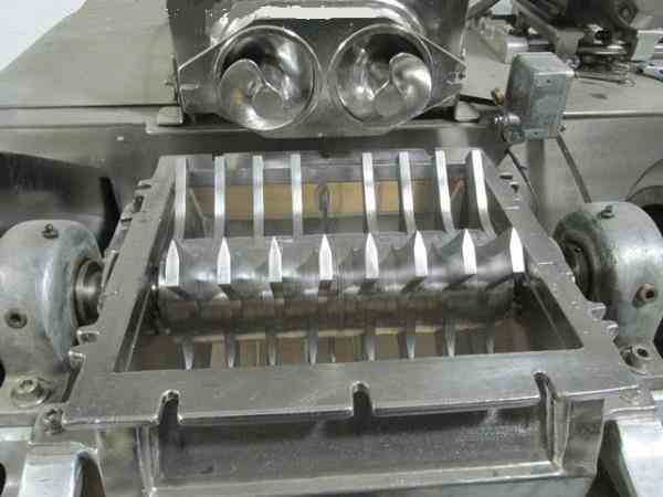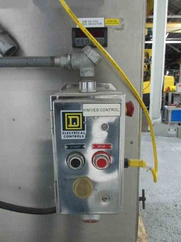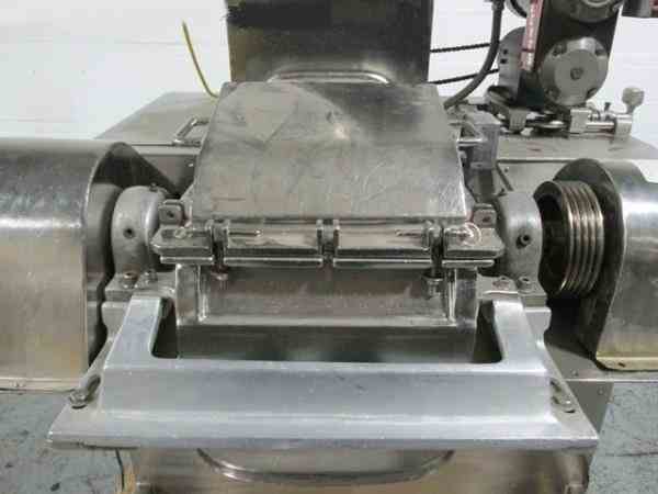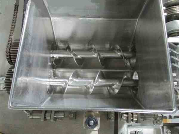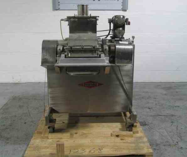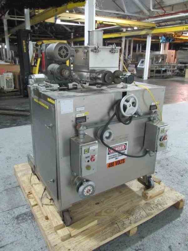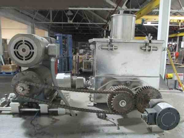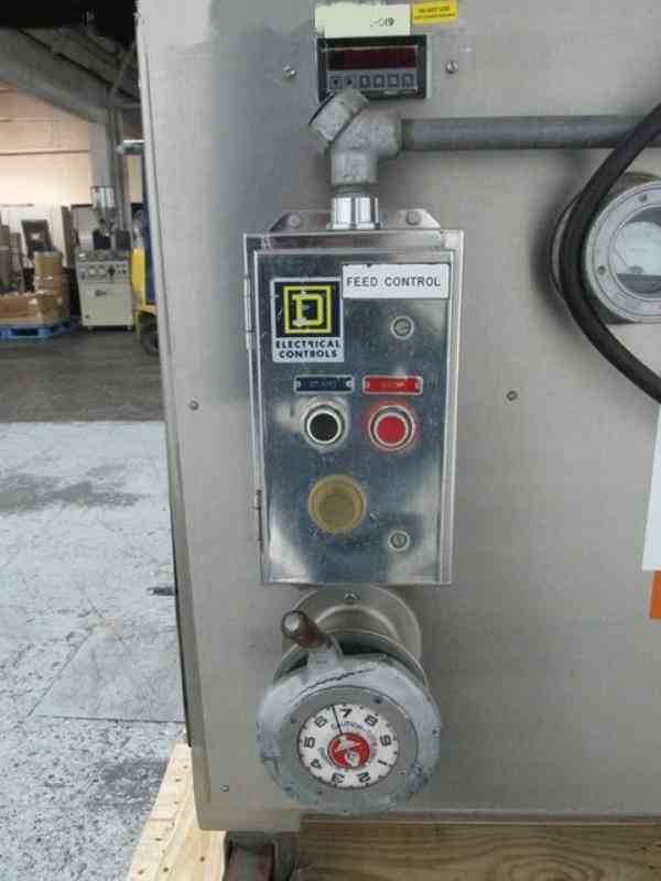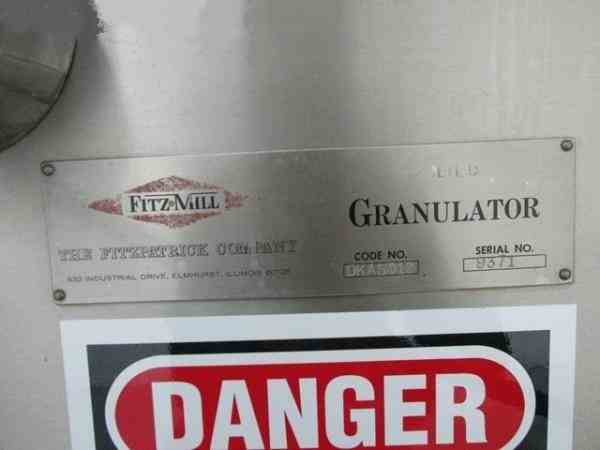 Used DKASO 12 Fitzmill, stainless steel construction, reversible chamber with fixed blades, outboard roller bearings, twin horizontal screw feeder with feed hopper, driven by .5 HP, 230/460 volt variable speed motor drive, on base with 10 HP, 230/460 volt variable speed main drive, serial# 9371.