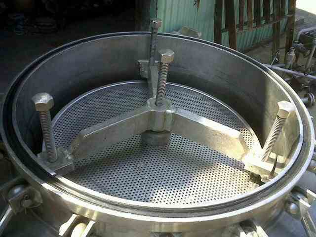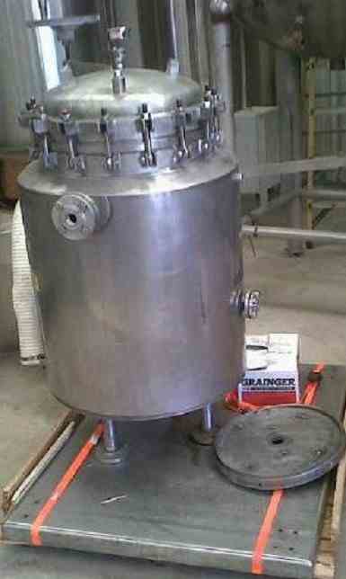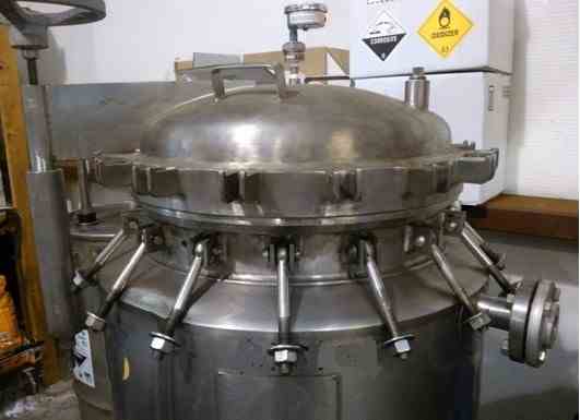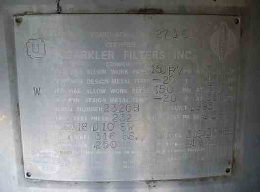 Used SPARKLER Pressure Leaf Filter Model 18-D-10 SP. Jacketed Pressure Filter. 316 Stainless Steel Contact Parts. Approx. 2 to 2.5 Cu.Ft. cake, 16-18 Sq.Ft surface area. Rated 150/FV PSI @ 350 Deg.F vessel and Jacket rated 150 PSI @ 350 Deg.F. NB# 2736. Last use was Sanitary, Pharmaceutical. Openings on bottom are 1.5"; 1/2" and 3/4"