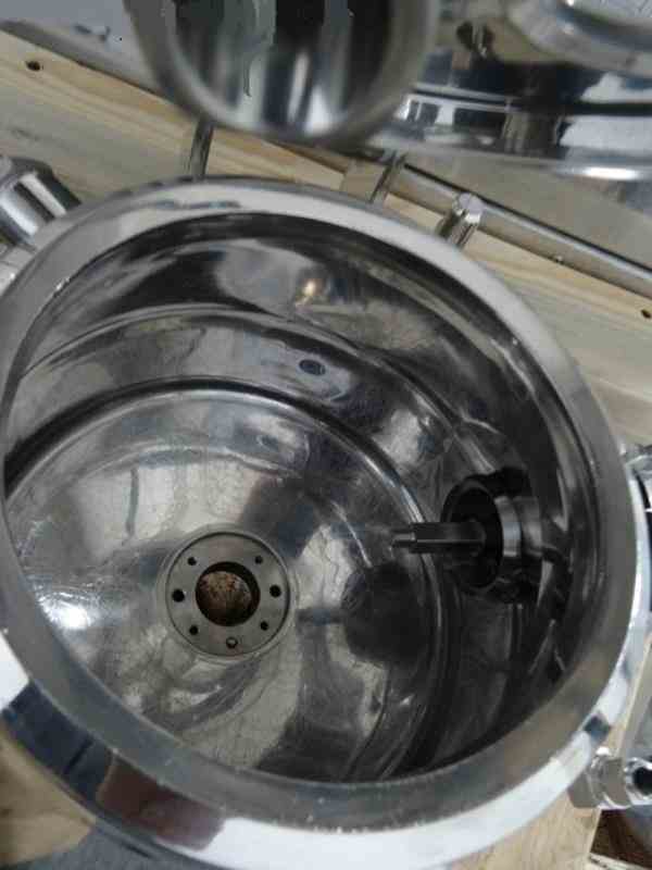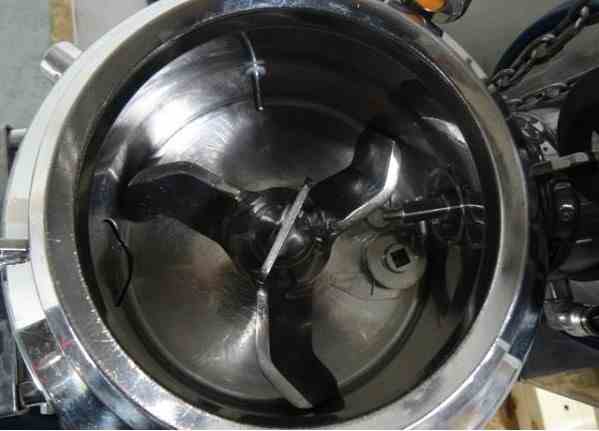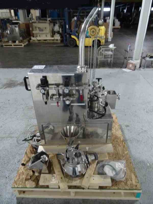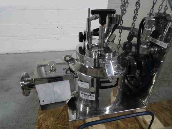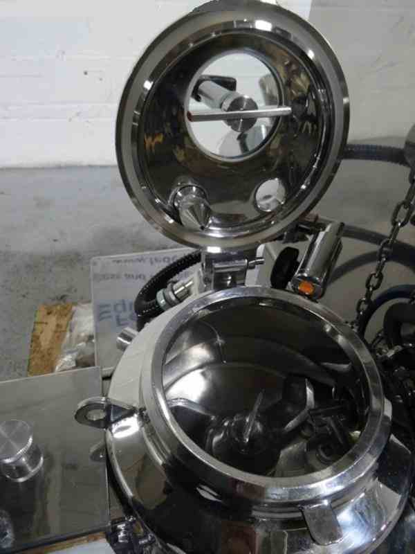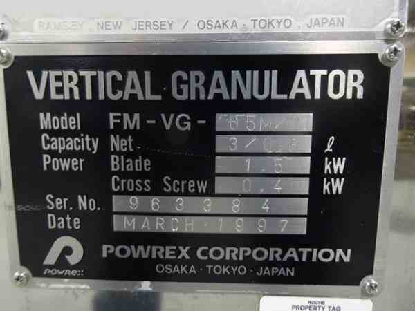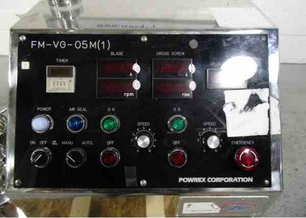 Used Powrex High Shear Granulating Mixer, model FM-VG-05M, 5 liter capacity, with 5 liter and 1 liter jacketed bowls with choppers, sanitary polished stainless steel construction, manually operated plug valve discharge, 1.5 KW variable speed main drive, .4 KW variable speed chopper drive, on portable base with controls, serial# 963384, new 1997. 5 liter bowl new 2006, 1 liter bowl new 2008.