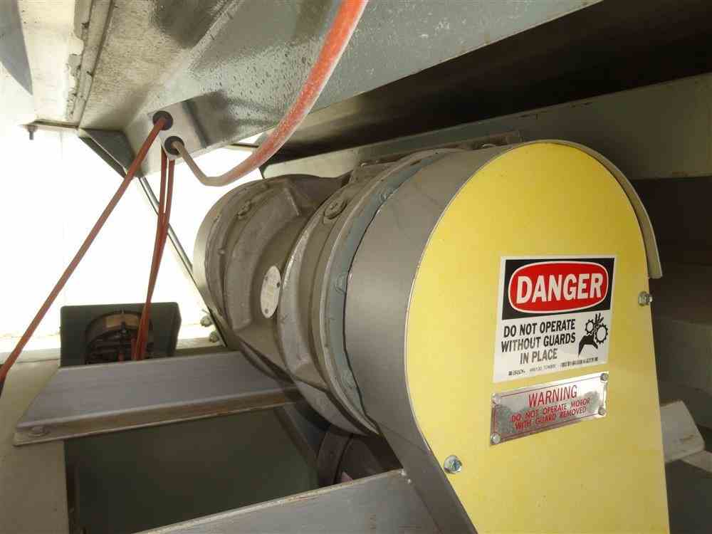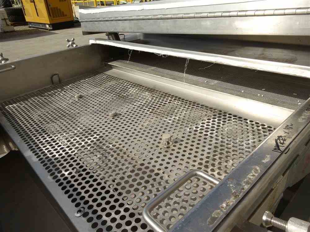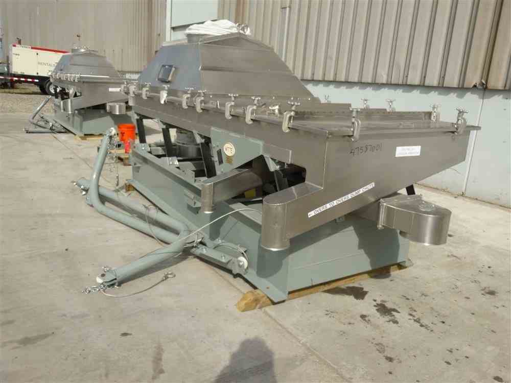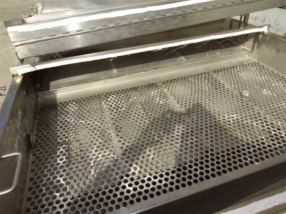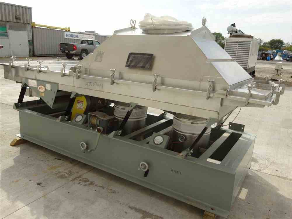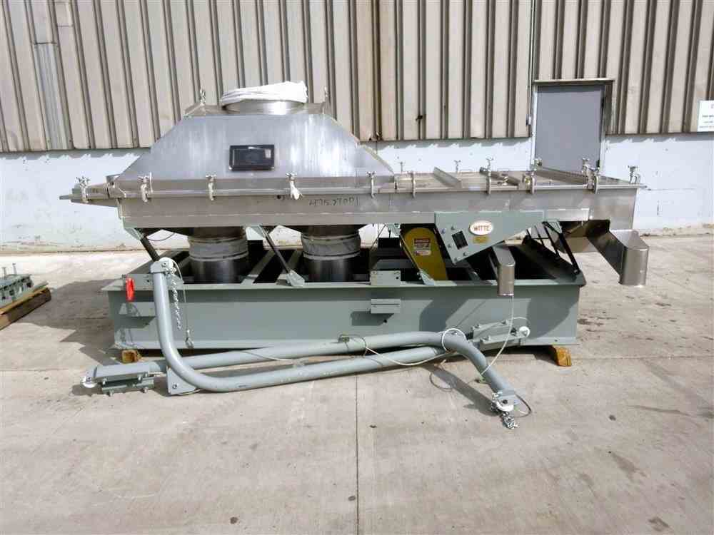 Used Witte Continuous Vibrating Fluid Bed Dryer Cooler Classifier, Model 448-Q, 304 Stainless Steel. 48" Wide x approximate 135" long 2 zone bed. Approximate 72" long wedge wire section with (2) screen sections, 3 total separations. Top clamp down cover with lifting mechanism, top end feed, bottom end discharge. Driven by a Witte size M5H vibrating motor, 1.5hp, 3/60/230/460 volt, 1725 rpm. Includes a water coil. Mounted on a carbon steel frame. Serial# 5974-3.
