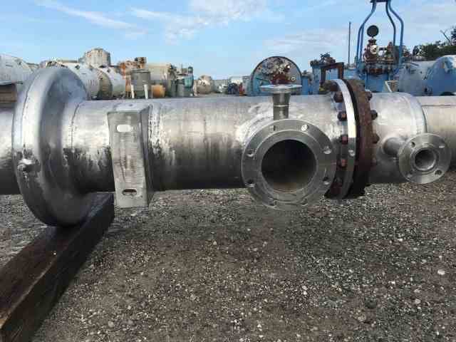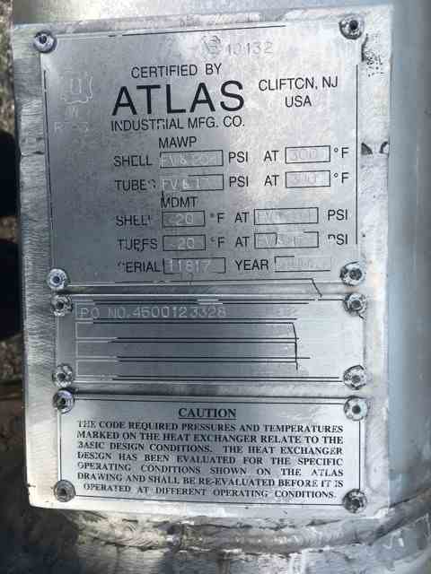Used Atlas Industrial MFG. approximately 375 square foot (4-Pass) Type 316L stainless steel shell and tube heat exchanger. 14” diameter X 16’ face to face length. Duplex stainless steel (AL2205) shell rated 204/FV @ -20 to 300 degrees F, (145) 5/8" 316L tubes rated 150/FV @ -20 to 300 degrees F. National Board# 10132, S/N 11817. 6” service nozzles, 3” process nozzles. Weight 2200#. Built 2006.