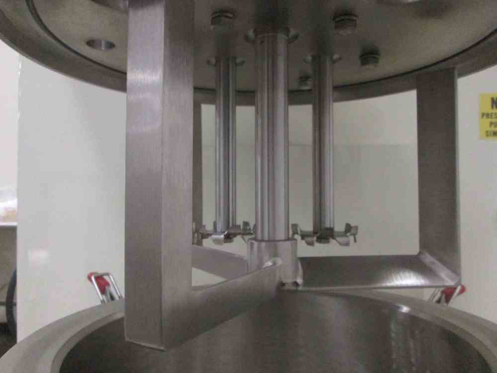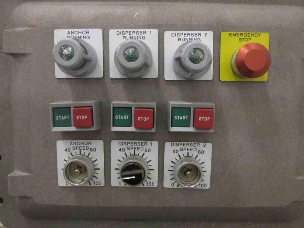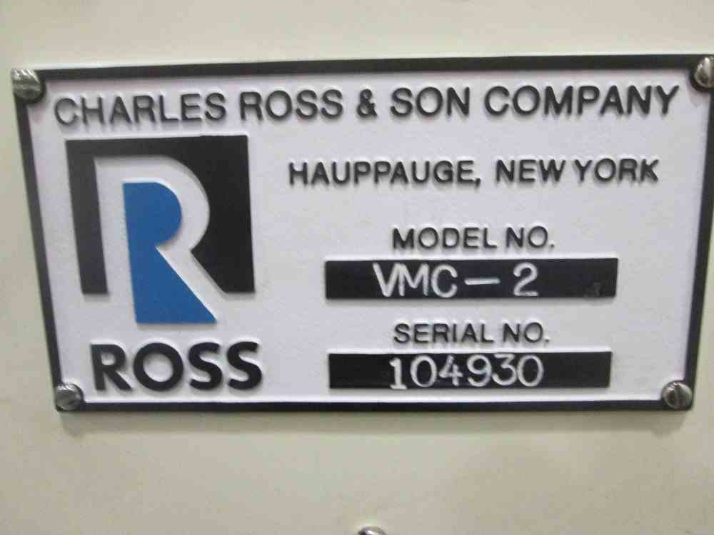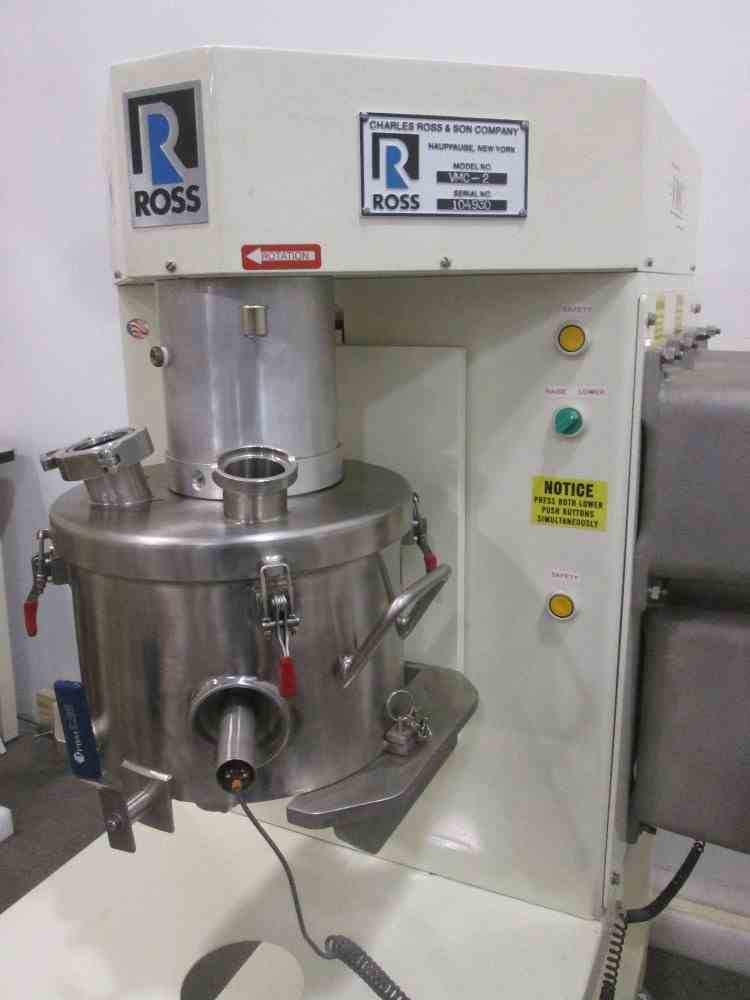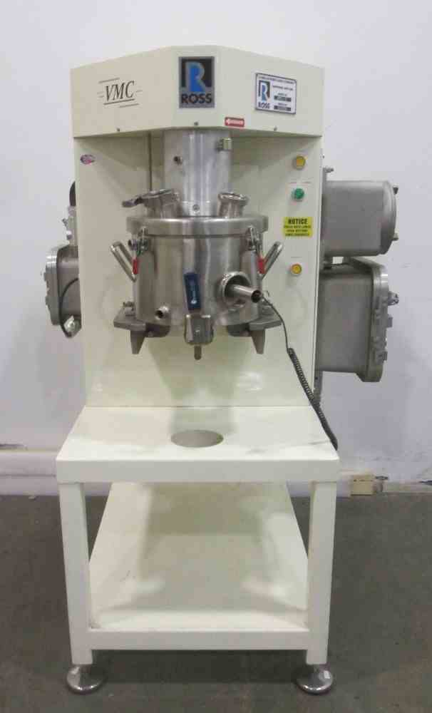 Used Ross VMC-2 Triple Shaft Versamixer Mixer. Stainless Steel construction. Vacuum capable. 2 gallon jacketed Vacuum capable mixing can with provision for thermal couple probe (Type J). Anchor agitator driven by 1HP, 230/460 volt xp motor (2) high speed dispersers each driven by 1 HP, 230/460 volt motor. Air over bowl lift/lower mechanism. Electrical 115V/60Hz. Serial# 104930