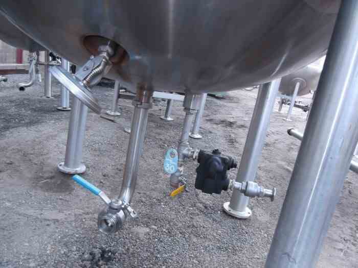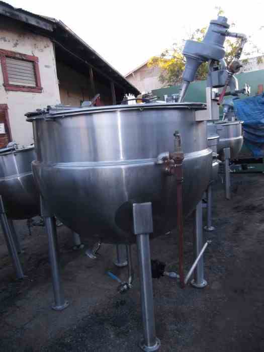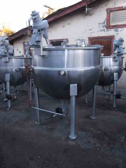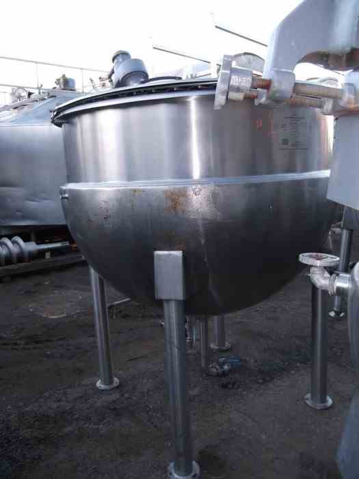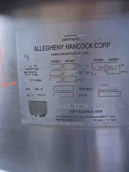 Used Hamilton 300 gallon agitated, stainless steel kettle, style SA. Includes clamp-on style, pneumatically drive prop-type agitator. Jacket rated for 125 PSI @ 344 deg. F/-20 deg. F. Kettle measures 56" diameter x 40" deep, Complete with hinged lid and dish bottom. Unit has 2" center bottom discharge. Manufactured by Allegheny Hancock Corp (Hamilton Kettle Division), Serial number F-3717-3, National Board number 126. New in 2001. Previously used in processing facility that manufactured condiments, jellies, dressing, sauces, and jams.