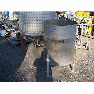 100 gallon vertical stainless steel tank. 30" diameter X 34" high straight side. Open top, slant bottom. Mounted on short legs. 1 1/2" center bottom drain