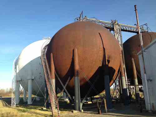 643767 Gallon Hortonsphere. Built by Horton Steel Works Ltd. 54'9"ID. Design pressure 37PSI @ 14 to 23F. Mounted on support columns on concrete pad. Spiral Stairway. Serial #9359A. Built 1960. Last used for Anhydrous Ammonia Storage.