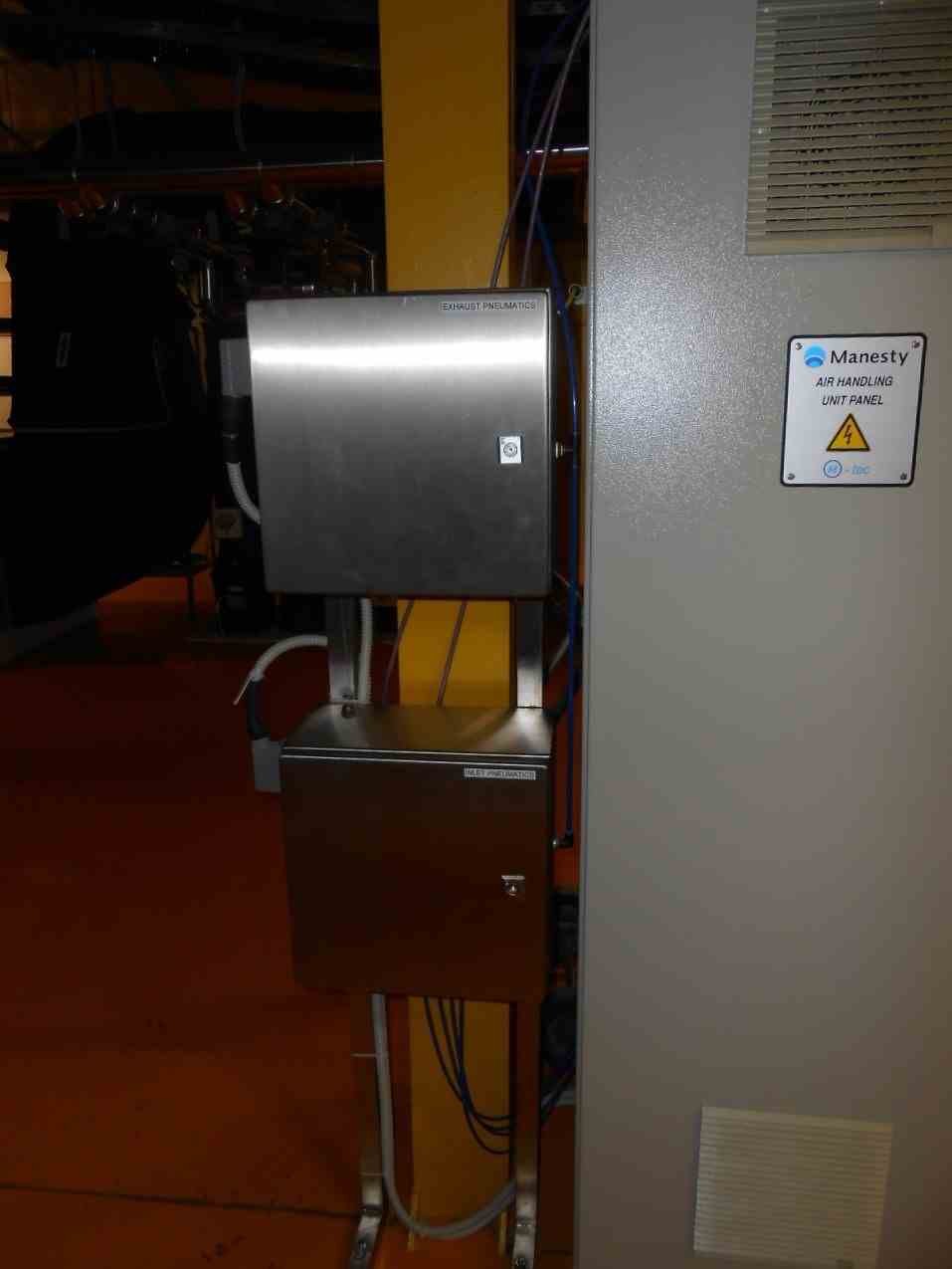 Used Manesty Film Coating System. Model XLlab02. 75l pan coating unit. Drum speed 20 rpm. spray rate 100-600ml/min. airflow 1000-1800 m3/hr. atomizing air and spray width 1.5-5 bar. Bypass air duct, control unit, suspension pump, dedusting unit, electric and pneumatic cabinets. Drum speed 20 rpm. spray rate 100-600ml/min. airflow 1000-1800 m3/hr. atomizing air and spray width 1.5-5 bar. Built 2004.