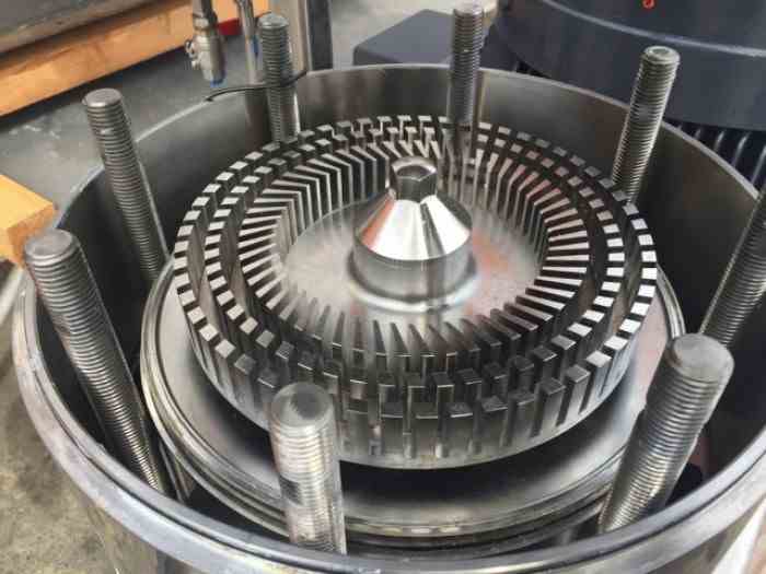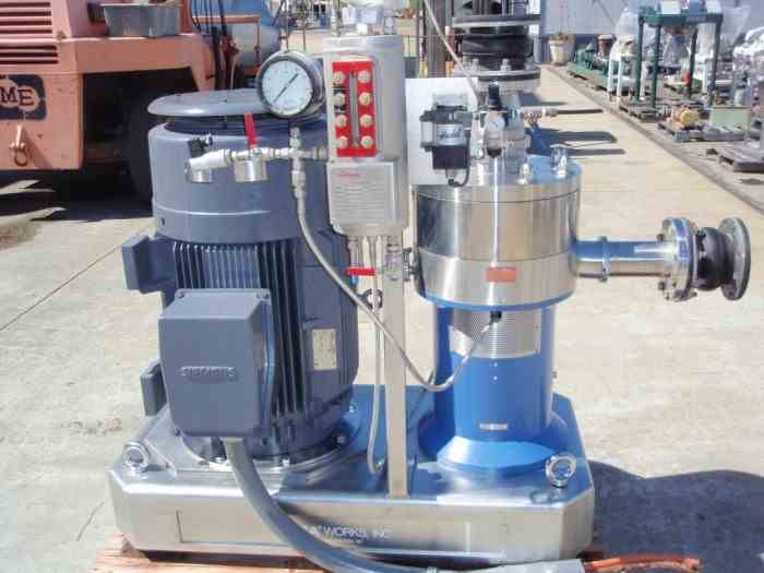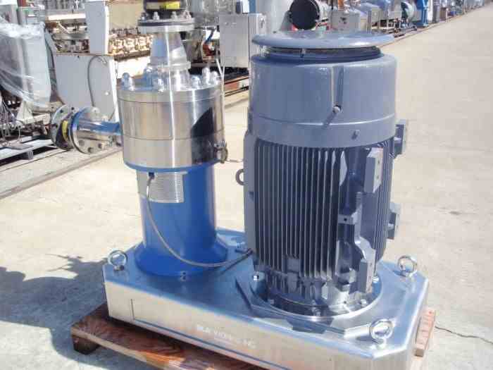Used DISPAX REACTOR, High shear mixer, inline, manufactured by IKA Works, 2000 series, type DR2000/40, stainless steel contacts, 11" diameter milling chamber, 6" diameter inlet, 4" diameter outlet, Model number P012237. Belt driven high-shear mixer, 150 HP, 1785 RPM, 460V, 3/60hz motor. Complete with Flowserve seal reservoir, rated for 960 PSI @ 100 deg. F. Rated for up to 300 GPM (water @ 70 deg. F); 4,290 FPM tip speed; 27,300 s-1 shear rate at each rotor/stator set; 0.03" radial gap. Three stage dispersing machine for micro-emulsions and very fine suspensions. Unitized on common stainless steel base. Serial# 2228-09. Very good condition.