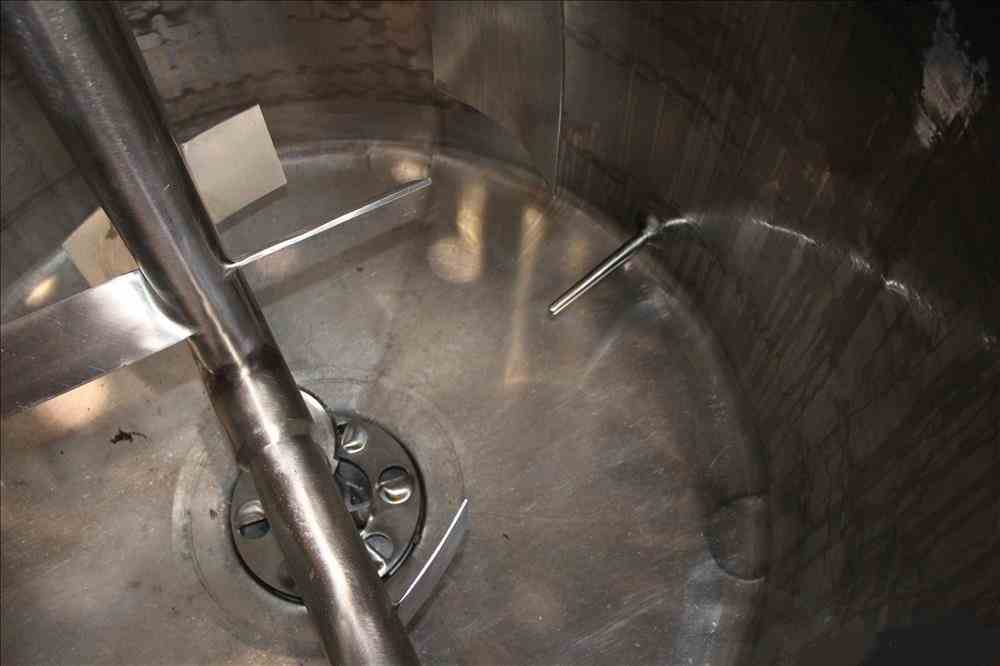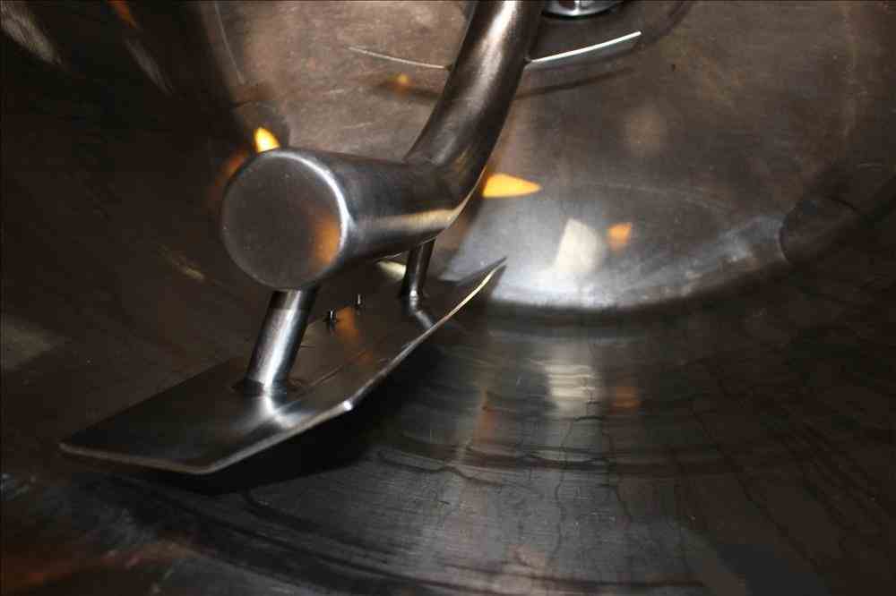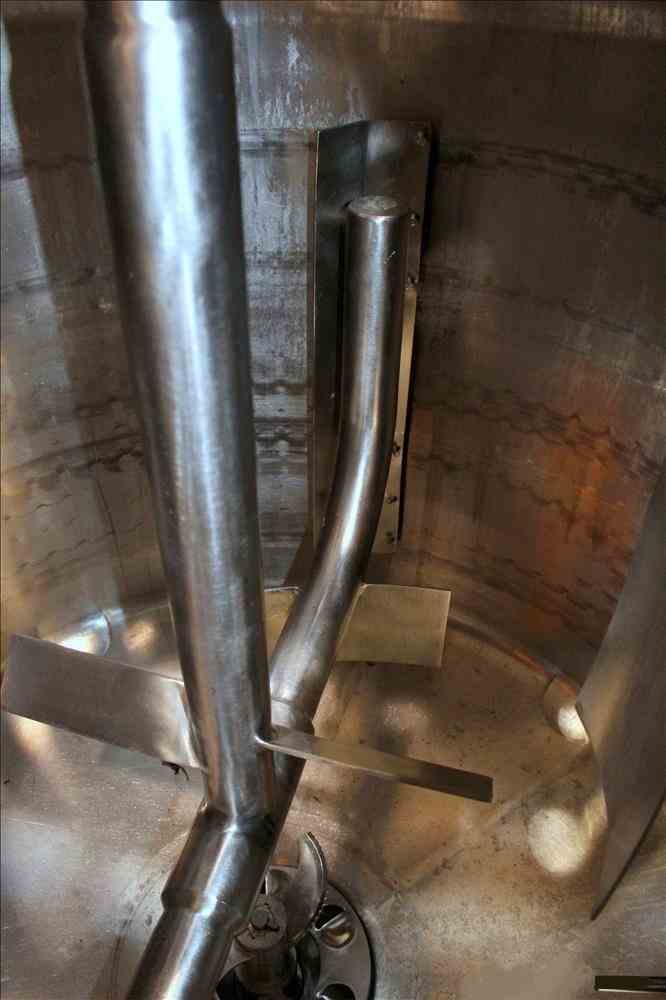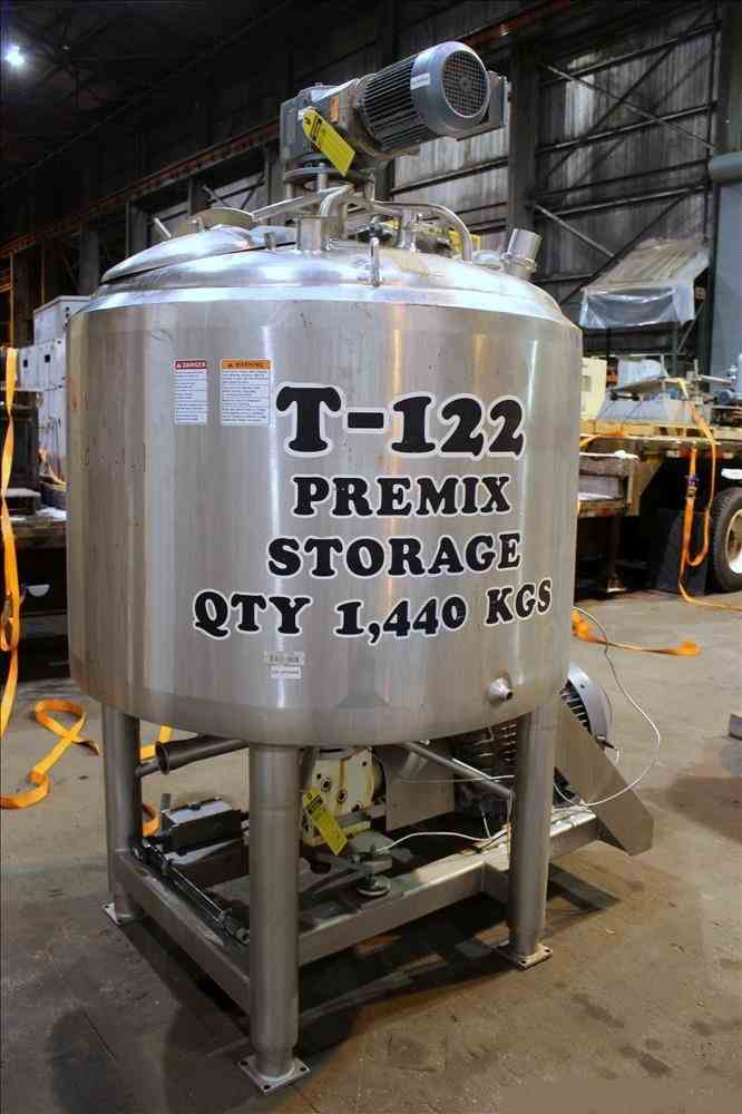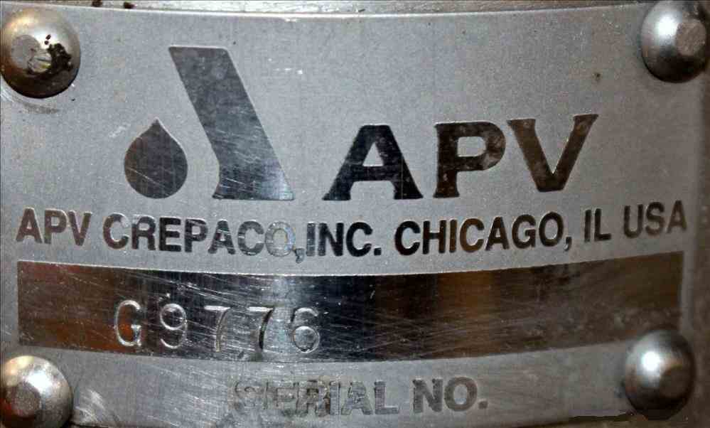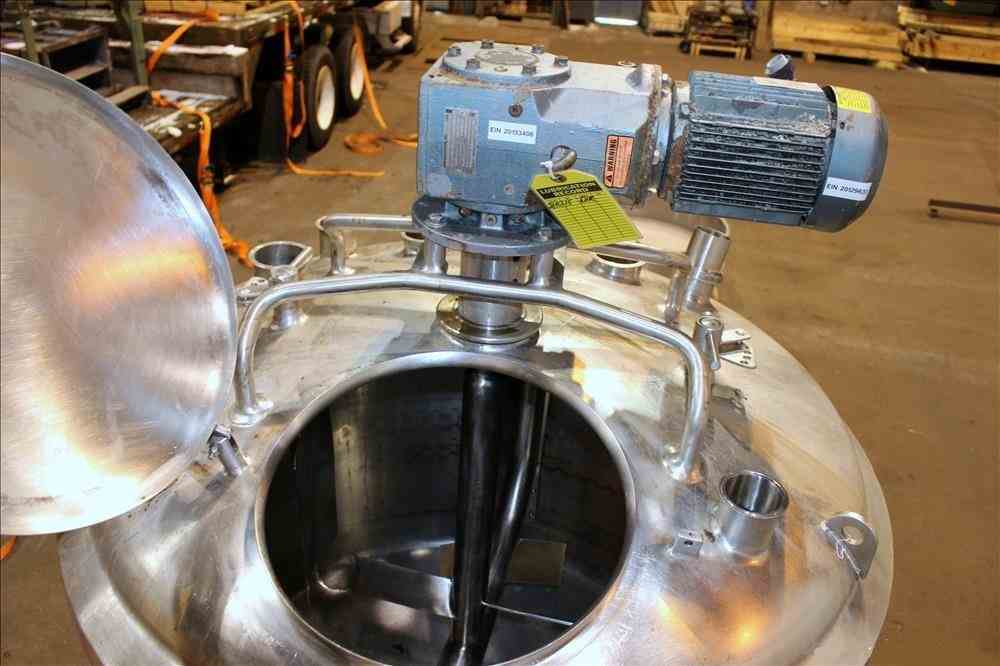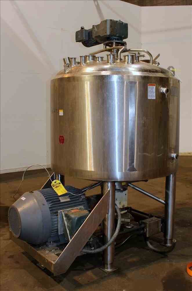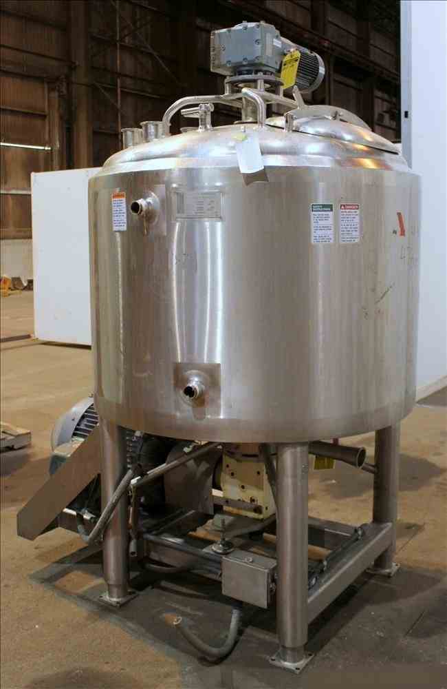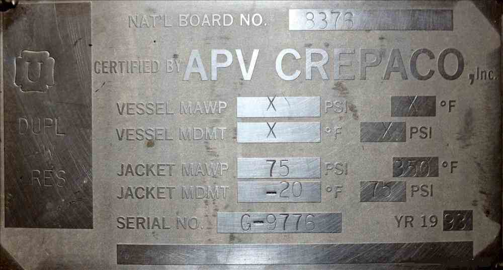 Used APV Crepaco Liquiverter Processor, Approximate 300 Gallon, 304 Stainless Steel. Jacketed tank 50" diameter x 34" straight side, dished top and bottom. Jacket rated 75 psi at -20 to 350 degrees F. Approximate 12" Bottom impeller, driven by a 60 HP, 3/60/230/460 volt, 1780 rpm motor. (1) Anchor style agitator driven by a 3 HP, 3/60/230/460 volt, 1700 rpm gear motor, 95.32 to 1 ratio. (2) Baffles. Openings top 18" man way with cover, (3) 4", (4) 3", (2) 2". 3" Bottom outlet. Mounted on (4) stainless steel legs, and a stainless steel frame. National Board# 8376, Serial# G9776. Built 1993.