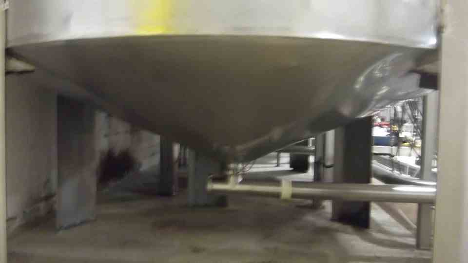 Used 1500 Gallon Stainless steel Mix tank with Flat top, Cone bottom. 6'D X 7'8" straight side, 13' High with agitator. Bridge mounted .3 HP Lightning model XJQ-30 mixer, 60/50 Cyc. 208-220/440, 1725/1425 rpm, 1.4-1.4/7 amp. Bottom of mixer blade is approx. 3' from bottom of cone. Approx. 10" Dia. mixer prop. Cone is approx. 16" deep. Mounted on (4) Stainless steel legs, 3" CBO, 21" top manway, with 6 top inlets; 2-4" triclover fittings. Last used in Sanitary application in Fruit Juice.
