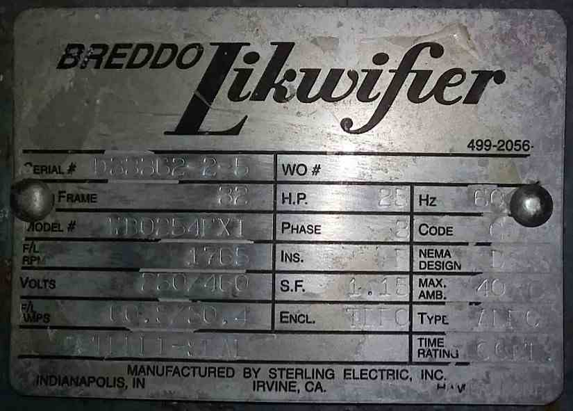 Used 200 GALLON BREDDO LIKWIFIER. Stainless Steel construction. 25HP direct Drive - 230/460V, 3 Ph, 60 Hz. Top lid and seal. Center bottom discharge. Tubular S/S frame legs on leveling pads. Serial #D33362-2-5.