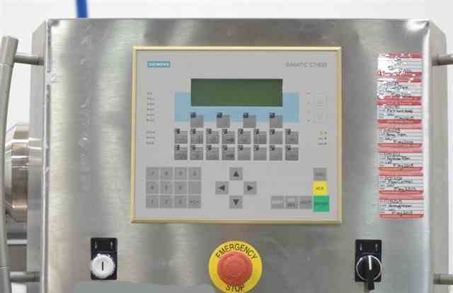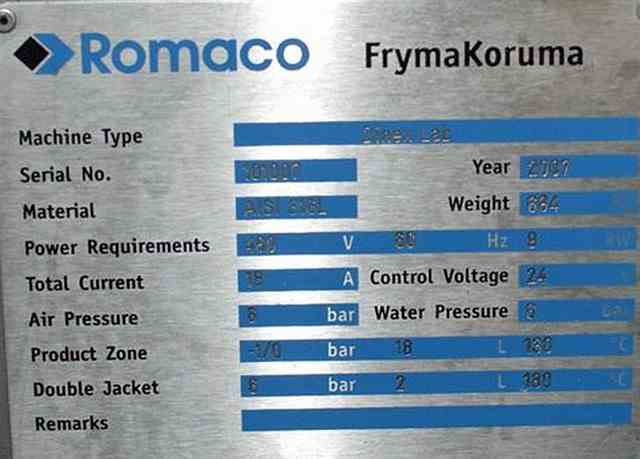 One used Romaco Fryma Koruma homogenizer colloid mill, model Dinex Lab, 316L stainless product contact surfaces, 18 liter total, 3-12 liter working pressure vessel, rated -1/0 bar at 130 c internal, jacketed for 6 bar at 180 c, double motion agitator, vertical orientation integrally mounted homogenizer with short and long loop external recirculation, lid lifting device, with additional powder feed and jacketed liquid feed hopper, on unitized base with Siemens PLC controls with Simatic C7 HMI operator controller, serial# 101007, built 2007.