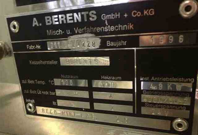 One used Berents Becomix Mini Lab Mixer, rated -1 / 1 bar at 100 deg C internal, jacketed for 4 bar at 110 deg C, top mounted mixer with side wall scrapper, bottom mounted homogenizer, variable speed with controls.