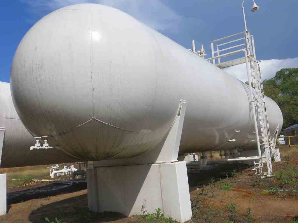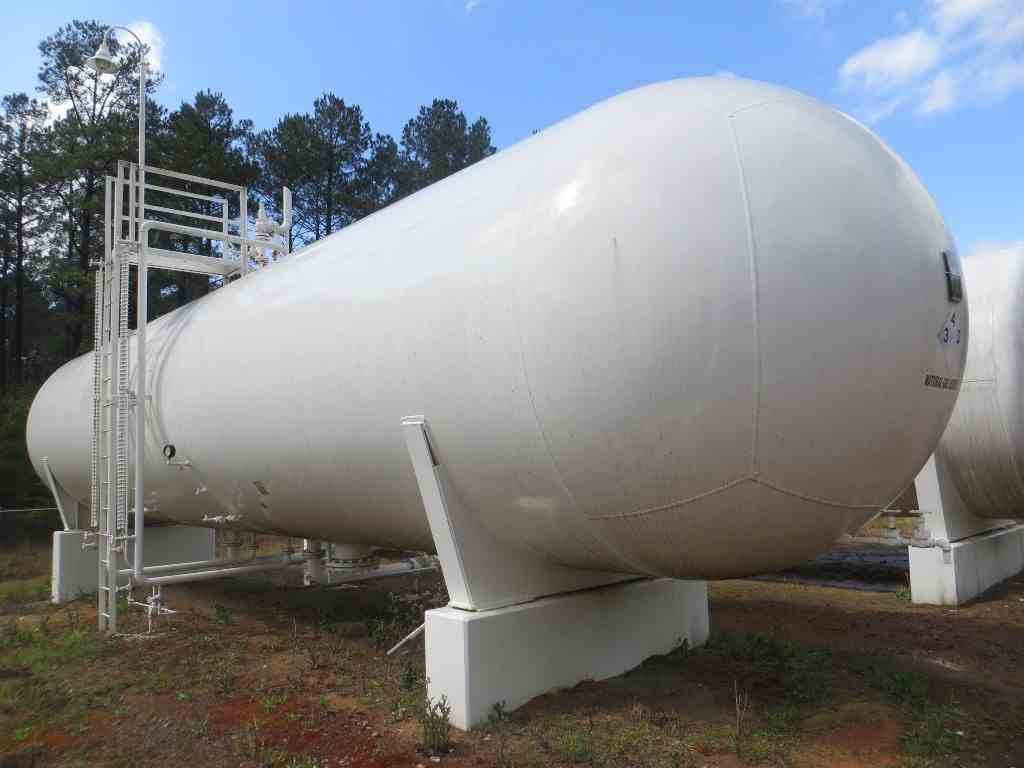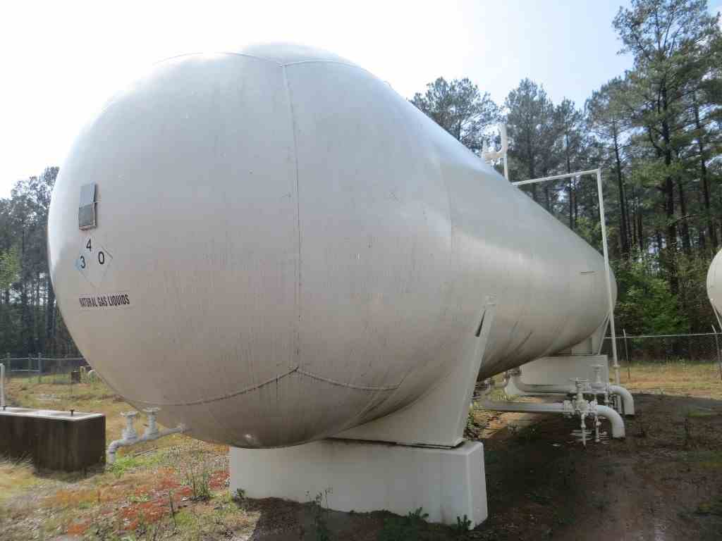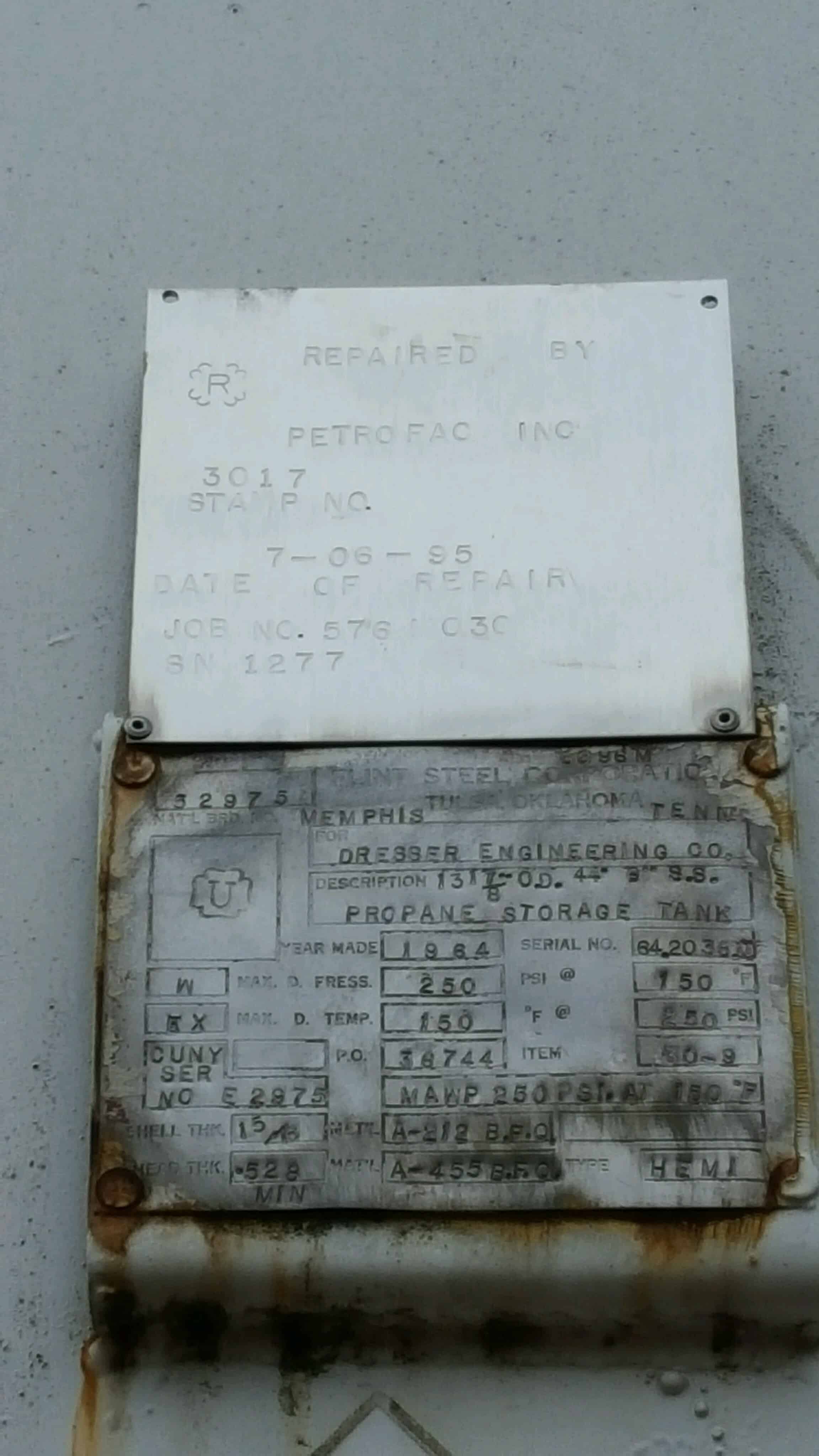 Used 30,000 gallon horizontal, Carbon Steel Tank, rated 250 psig @ 150 deg F, 11' Dia x 55'6" OAL. Mfg. by Flint Steel - 1964, ASME code built, S/N 64-2036-M, NB# 52975, Thickness - Shell: 1-5/8", Heads: .529". Mounted on saddles. Code papers on file.