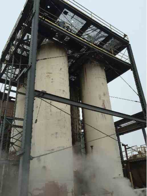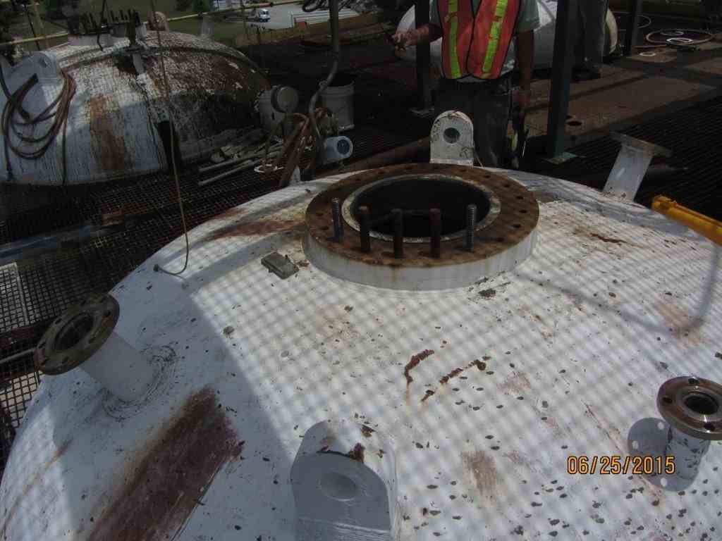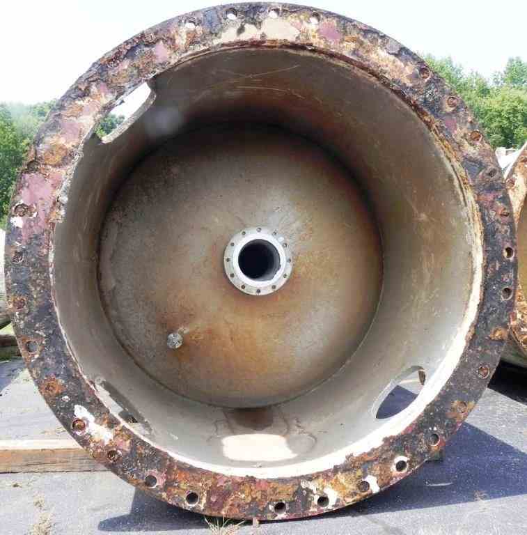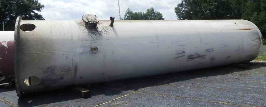 Used 18,000 Gal Vertical CS Pressure Tank, rated 650 PSI @ 300 F. 9'dia x 44'H. 304-SS Clad interior lining. Thickness: Shell: 1.87"; Head: 1.92". Skirt mounted, Lifting Lugs. Mfg by Combustion Engineering, 1980. S/N: 1358, NB# 22530. Wt: 110,000 lbs.