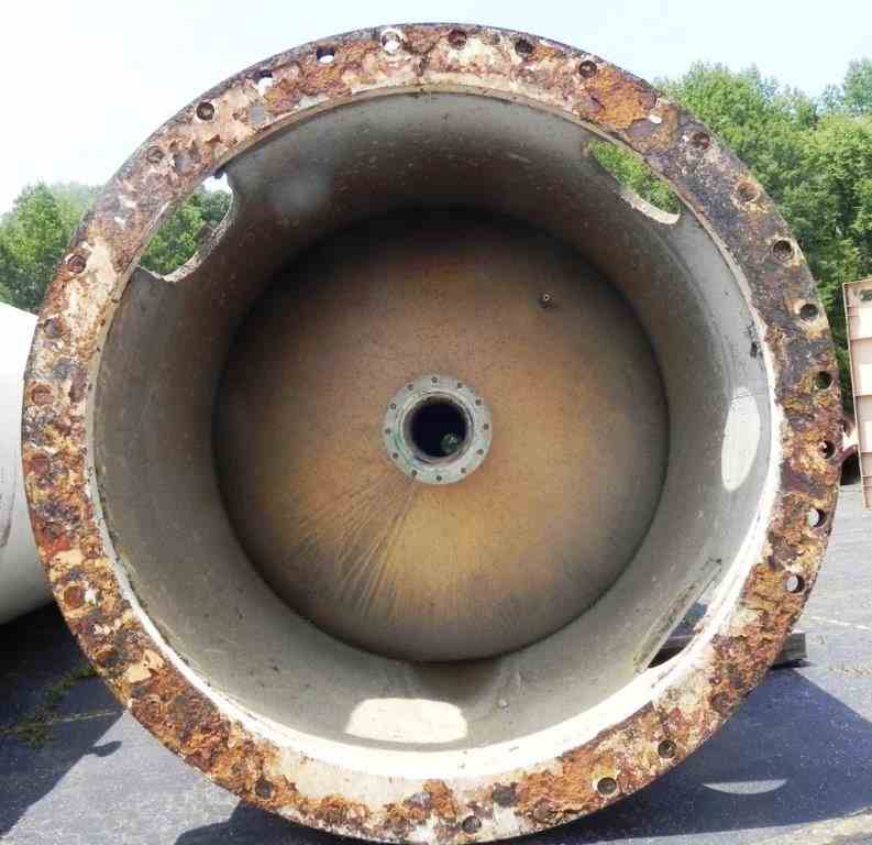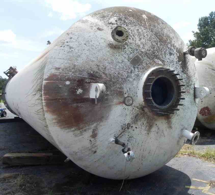 Used 18,000 Gal Vertical CS Pressure Tank, rated 650 PSI @ 300 F. 9'dia x 44'H. 304-SS Clad interior lining. Thickness: Shell: 1.87"; Head: 1.92". Skirt mounted, Lifting Lugs. Mfg by Combustion Engineering, 1980. S/N: 1361, NB# 22667. Wt: 125,000 lbs. U-1 on file.