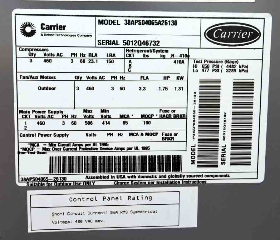 Used Carrier Air Cooled Condensing Unit, 39.8 Tons, Model 38APS04065A26130. 460/60/3. R-410A Refrigerant. Serial# 5012Q46732. Built 2012.