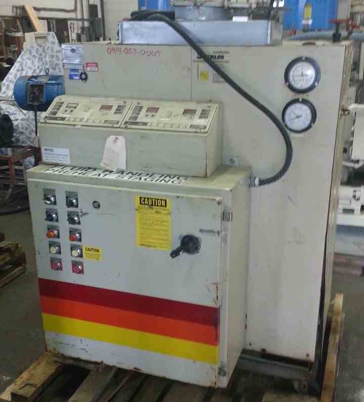 Used 24 KW Sterlco Model M-6026-DX Temperature Control System, 2 zone, 12 KW per zone, 3/60/460 volt, temperature to 550F, with cooling circuit, (2)- .75 HP. Positive displacement pumps, complete with controls.