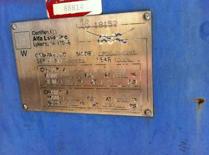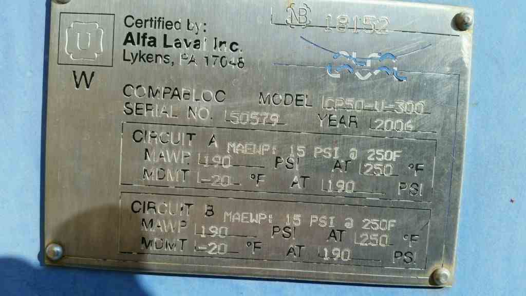 USED ALFA LAVAL 871 SQ.FT. COMPABLOC MODEL CP50V300 TITANIUM WELDED PLATE HEAT EXCHANGER. RATED CIRCUIT “A” MAWP 190PSI @ 250F, MDMT -20F@190 PSI. CIRCUIT “B” MAWP 190PSI @ 250F, MDMT -20 DEG F @ 190 PSI.