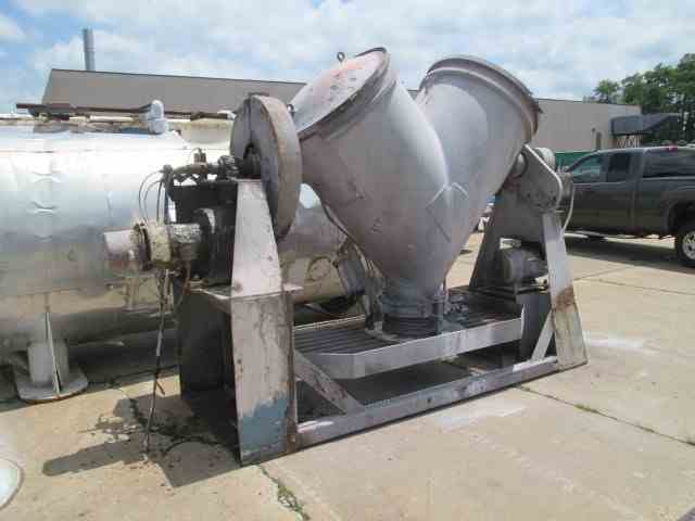 Used 40 cu ft PK Twin Shell Blender, carbon steel epoxy lined, with bar. Stainless steel high intensity liquid solids bar. 5 HP shell drive, gear reduced to gear driven, 3 phase, 208-220/440 voltage with Stearns brake. 10 HP bar drive, 3 phase, 208-220/440 voltage V-belt driven, with guard. Seals are air purge. Clamp on full access 40" diameter doors.