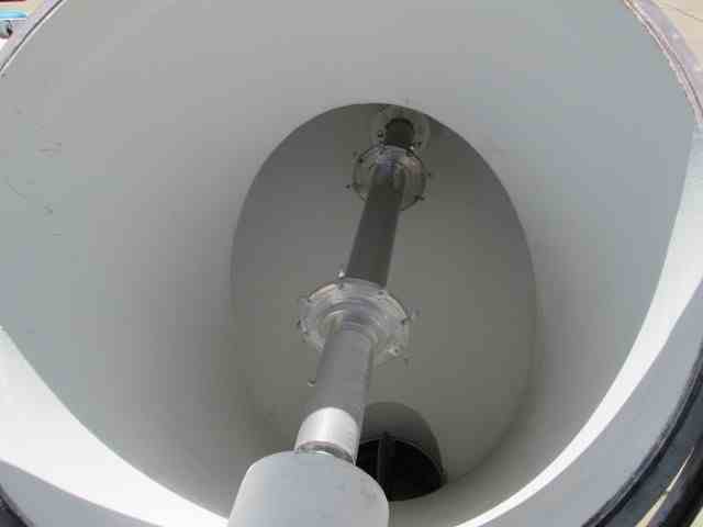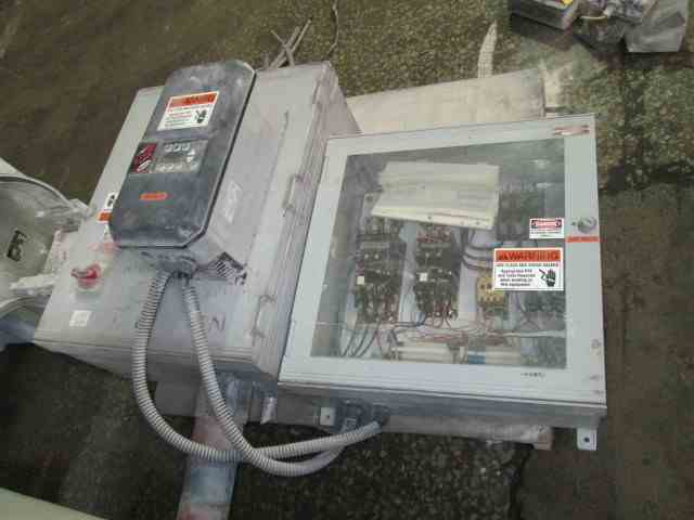 12" diameter pneumatically operated discharge butterfly valve. Equipped with Rotary union for liquid add thru bar. Also with pneumatically operated dust control discharge chute. On stand with outboard roller bearings. Includes pallet of spare parts. Overall dimensions: 12' L-R, 52.5" F-B, 98.5" high.