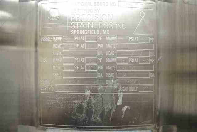 One used 500 liter Precision Stainless receiver, 316L stainless steel construction, removable dish top, dish bottom, rated 50 psi and full vacuum at 302 f internal, 304L stainless steel jacket rated 100 psi and full vacuum at 302 f, on legs, serial# 210627-6, national board# 9372, new 2001.