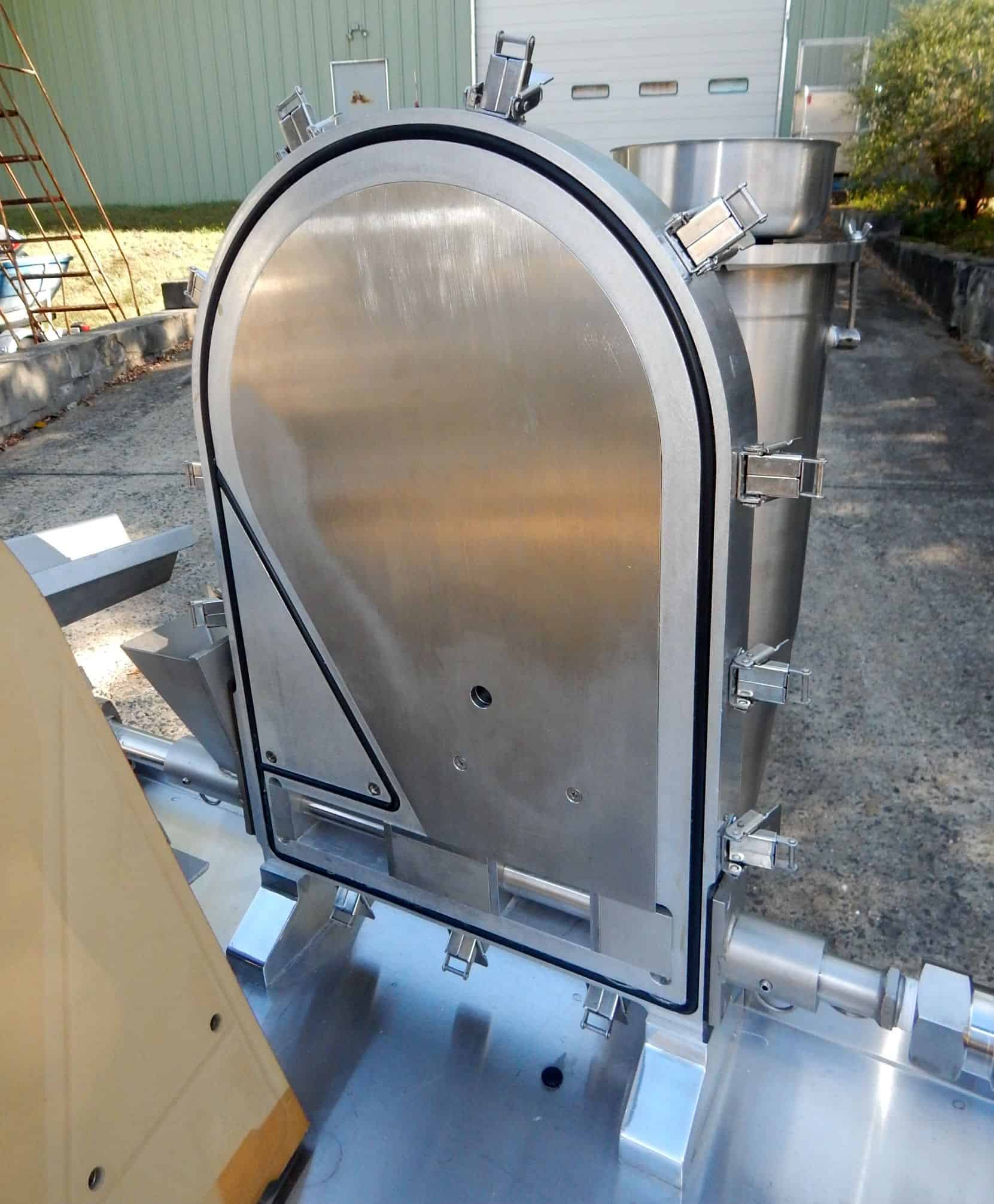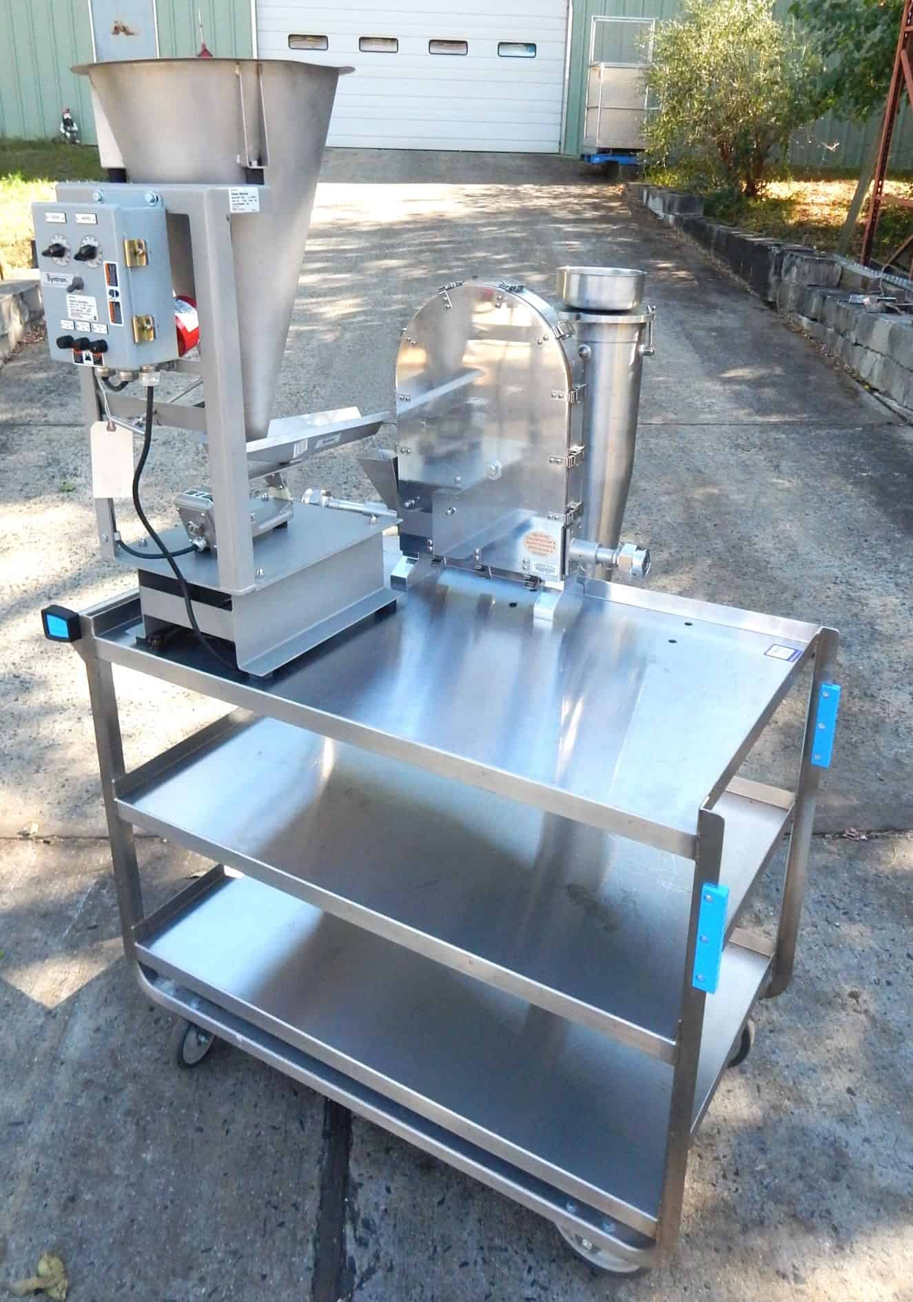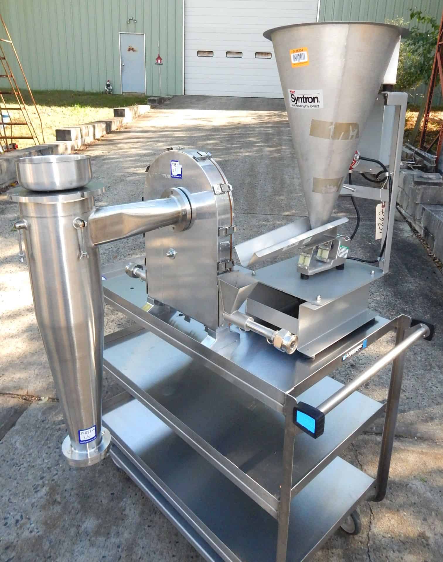 Used Trost air impact pulverizer (jet mill) Model T-15, serial # N/A. Features all stainless steel pharmaceutical grade contact parts with urethane lined mill, .75 cubic foot stainless steel conical feed hopper with manually adjustable flow and side mounted vibrator to 16" long "v" bottom pan feed as unitized unit by FMC Syntron Model FMT0-C3/4, 115 volt/1 phase controller includes hopper and feeder vibrator controls unitized in frame with vibration dampening table feet, discharge cyclone, manufacturer recommendations require 1/8 particle feed size or smaller, 1 to 250 lbs./hour capacity rate with average being 10 to 50 lbs./hour, requires 60, 80 and 100 scfm compressed to 100 psig, mount in stainless steel portable cart with multiple shelves 24" wide x 48" long x 36" high. Previous use: Pharmaceutical.