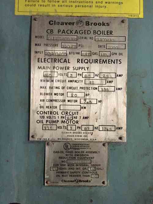 Used Cleaver Brooks CB1200-500 Gas Fired Packaged Boiler. 500 HP. Max Pressure (Steam) 150PSI. Serial # 011C0510. Built 2000.