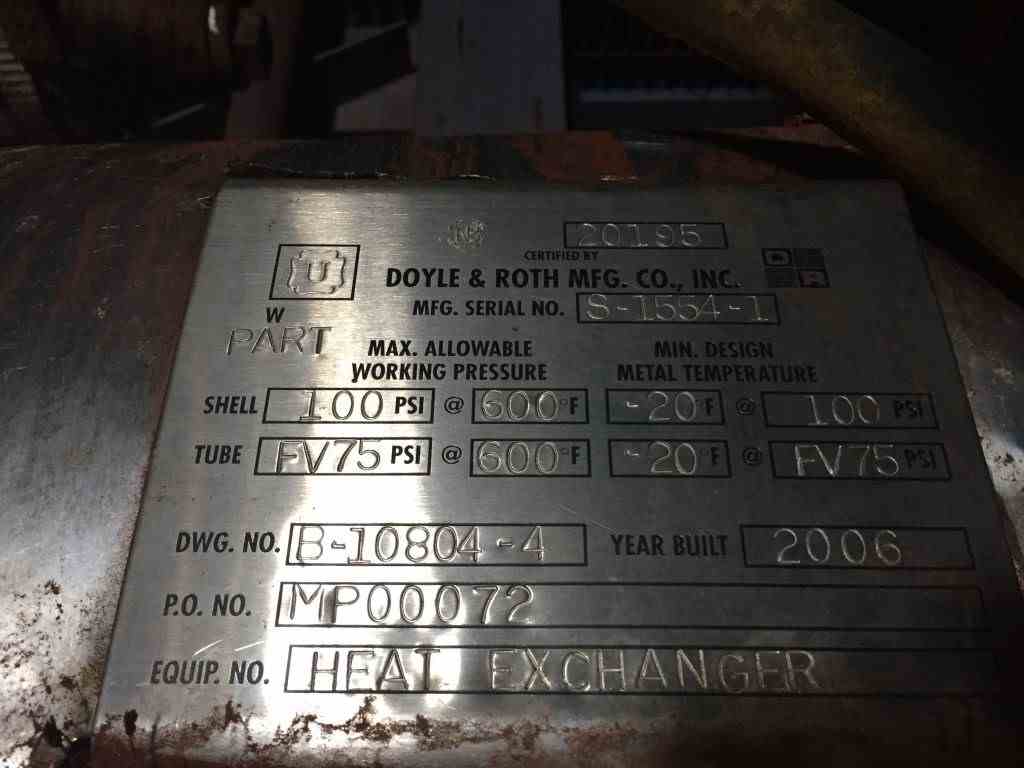 Used 320 Sq. Ft. Doyle and Roth Shell and Tube Heat exchanger. Shell Rated 100PSI @600F. Tubes rated 75PSI/FV@600F. National Board #20195. Serial #S-1554-1. Built 2006.