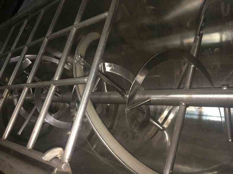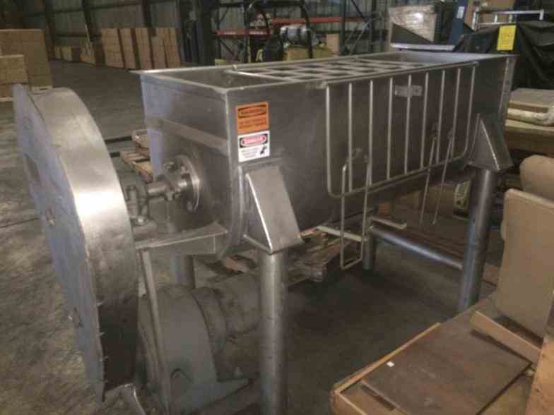 Used approximately 20 cubic foot stainless steel double ribbon blender. Approximately 26" wide X 65" long X 29" deep. Double ribbon. Center bottom discharge with valve. 3 phase 60 cycle 208-220/440 volt 1610 rpm motor with drive. 4 Legs. Built by Day.