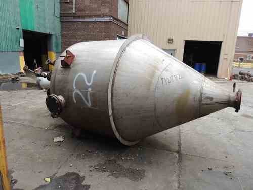 Used 1000 Gallon SS Cone Bottom Vertical Tank. Mfg RAS. MAWP 75PSI/FV @ 150F. 6' Dia x 9'6"H. Dome Top with (1) 20" Manway. Lug Mounted. National Board #533. Serial # 951135. Built 1995.