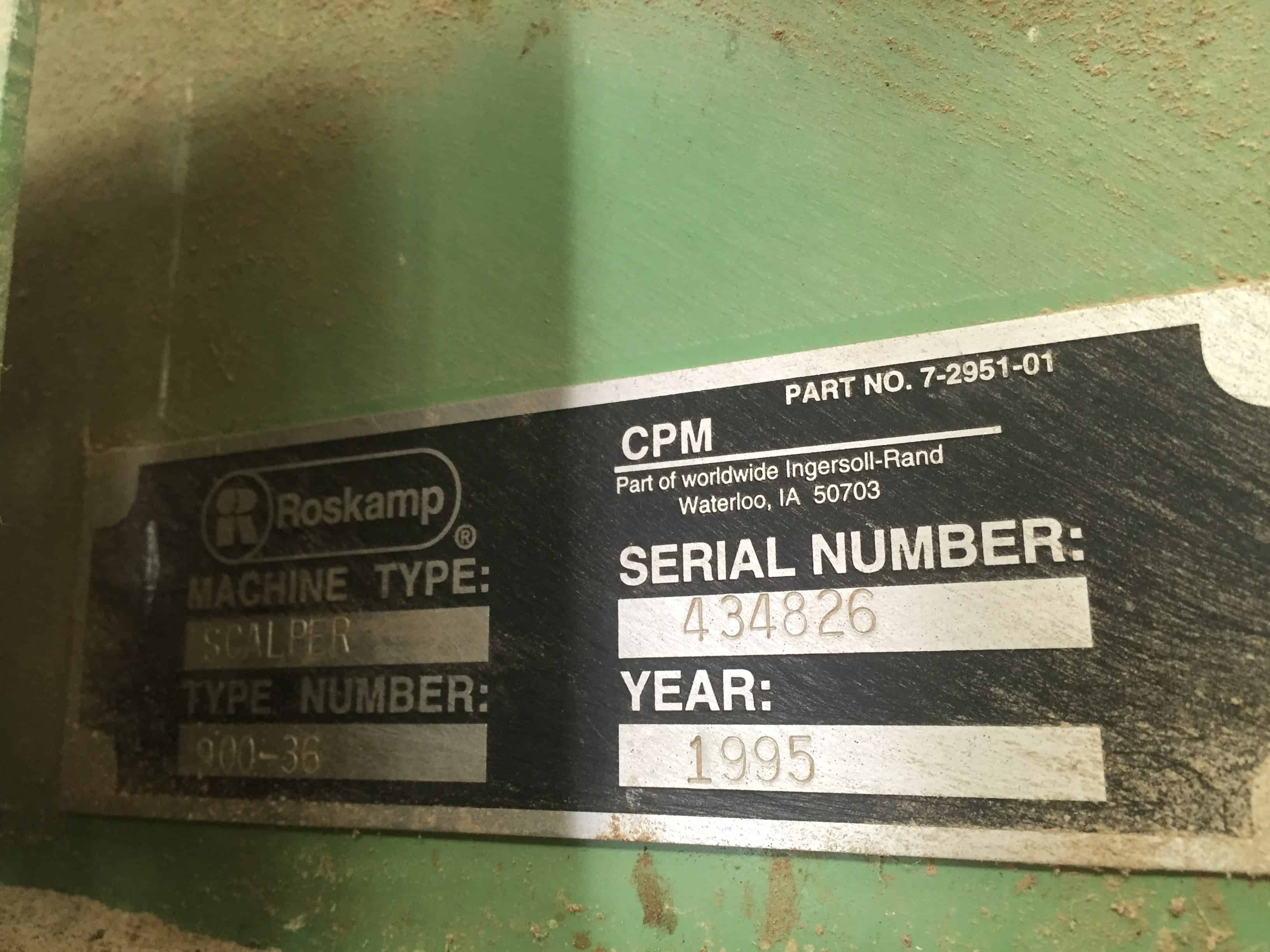 Used Roskamp Scalper Double Roller Mill. Type 900-36. 9" Dia x 36" Roll. 50HP motor. Serial #434826. Built 1995.