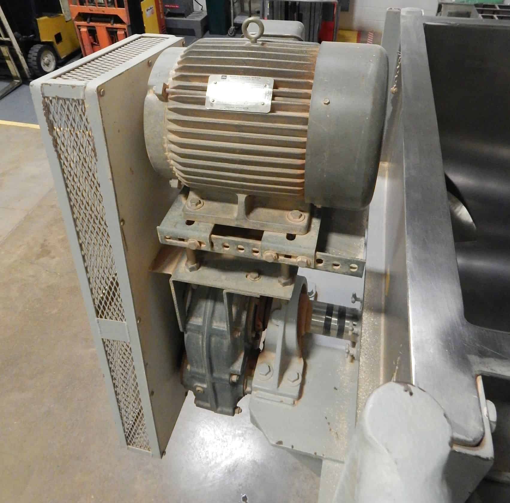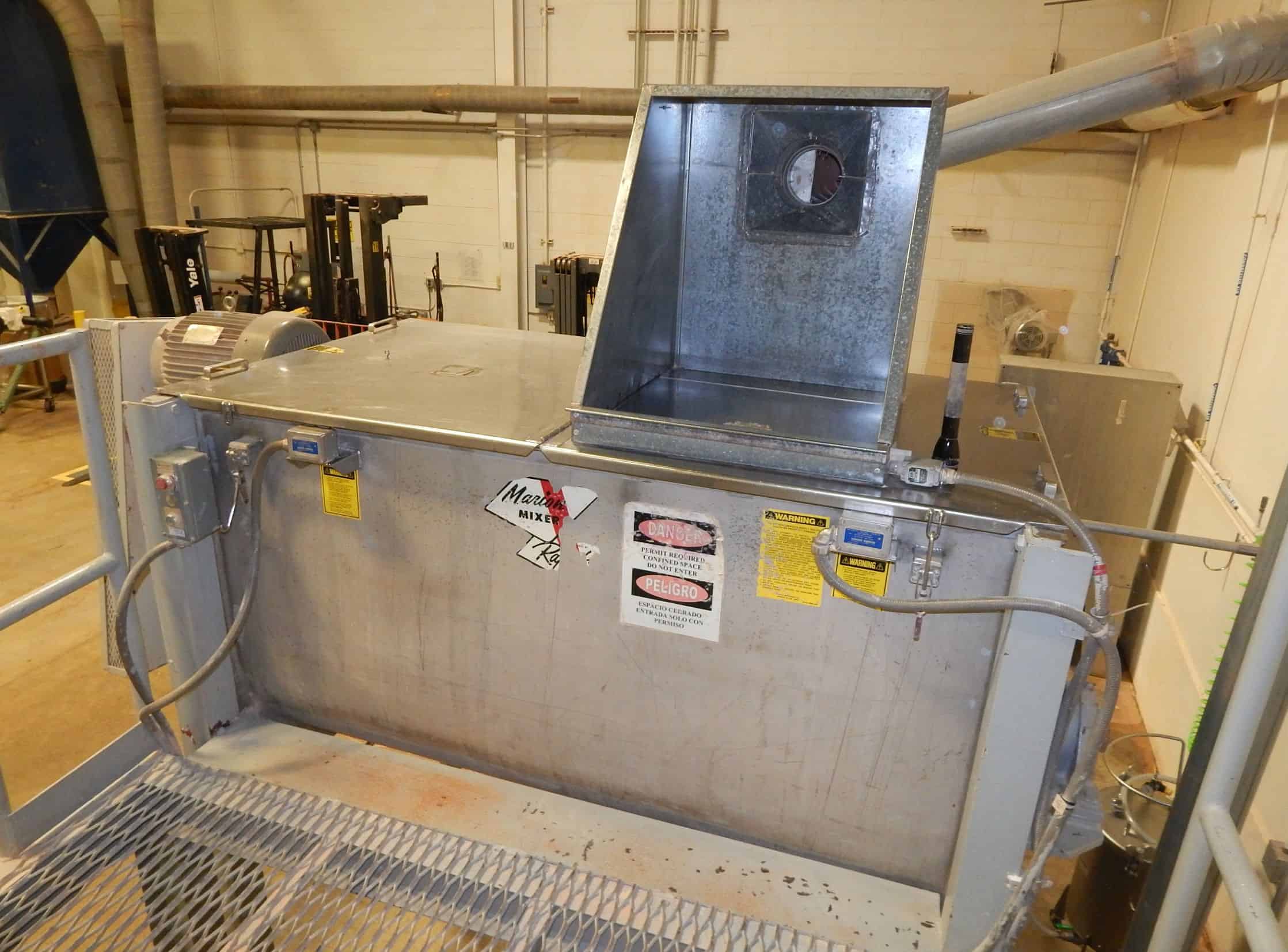 Used Stainless steel sanitary paddle mixer by Marion Mixer, Model 6051, serial # B3005. Features USDA approved design, (# FP-3672) with all welded and polished to sanitary standards paddles, arms and interior of mixer, 45 cubic foot manufacturer rated mixing capacity, 62 cubic foot total capacity. Inside mixer dimensions 36" wide x 72" long. Standard discharge with manually operated butterfly valve and 38" discharge clearance. T^o internal atomizing liquid spray nozzles. Mixer is belt driven by aprox 15 HP motor and on shaft gear reducer. Easy breakdown shaft seals with teflon packing. Blender includes work platform as shown, discharge and loading dust hoods, full cover and mounted on painted steel legs. Formerly used in branded cosmetic manufacturing. Blender available after march 2017.