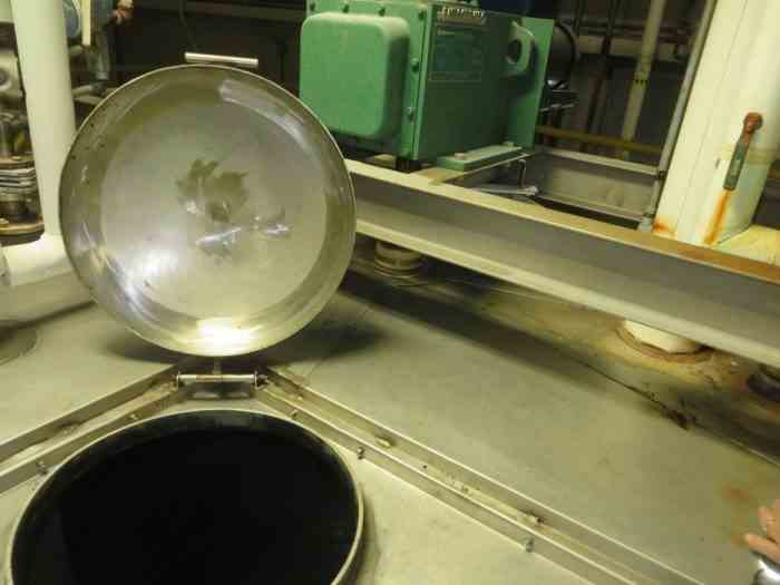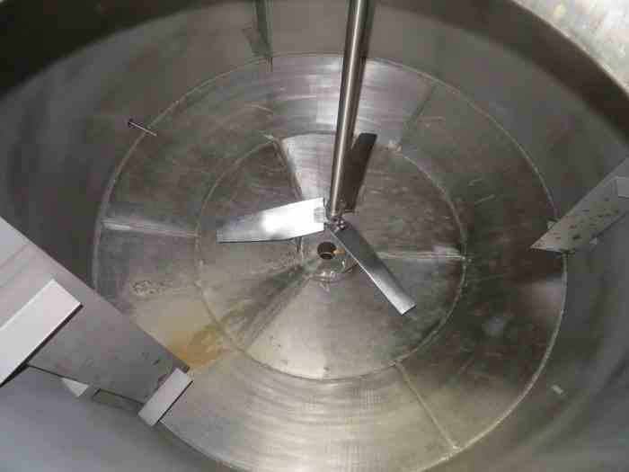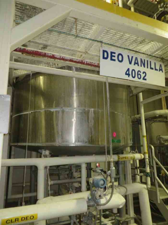 USED APPROXIMATELY 2,000 GALLON VERTICAL STAINLESS STEEL TANK. 7'8" DIAMETER X 6' STRAIGHT SIDE. WITH FLAT TOP HEAD. 5 HP BRIDGE-MOUNTED LIGHTNIN 3-BLADE TURBINE AGITATOR WITH BAFFLES. BOTTOM DIMPLE JACKET. 6" DIAMETER X 30" LONG ENERQUIP HEAT EXCHANGER RATED 150 PSI/FULL VACUUM @ 375°F SHELL AND TUBE.